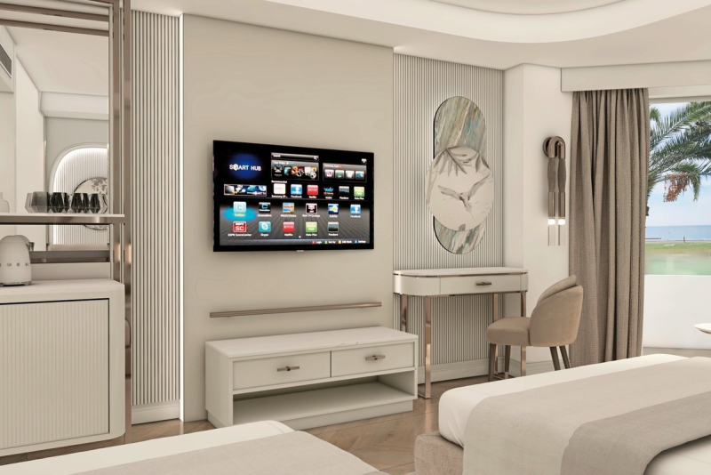 Die Zimmer im Delphin Palace sind komfortabel und modern ausgestattet. Neben Doppelzimmern und Familienzimmern mit getrennten Schlafzimmern gibt es auch Juniorsuiten mit einem Whirlpool im Badezimmer. Alle Zimmer verfügen über WLAN, eine Minibar und eine Klimaanlage.