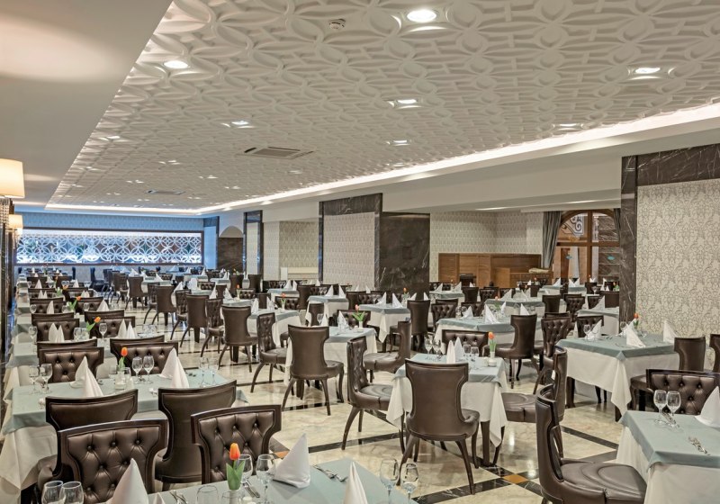 Die Gastronomie stützt sich auf ein Buffetrestaurant mit Terrasse, mehrere À‑la‑carte‑Optionen und eine Patisserie. Insgesamt stehen zehn Restaurants zur Verfügung, ergänzt von Bars – darunter Lobbybar, Poolbar und eine Strandbar. All‑Inclusive Plus umfasst Speisen und Getränke mit Live‑Kochen, alkoholische wie alkoholfreie Optionen, Snacks und spezielle Angebote. So plant Ihr Eure Mahlzeiten flexibel zwischen draußen und drinnen. Highlight: All‑Inclusive Plus mit Live‑Kochen und breiter Getränkeauswahl.