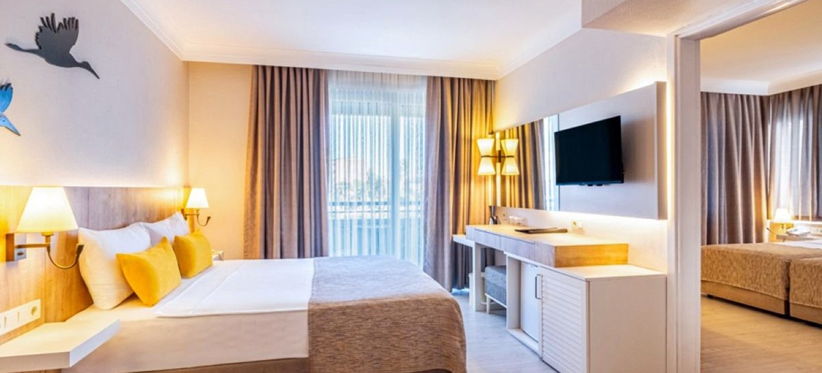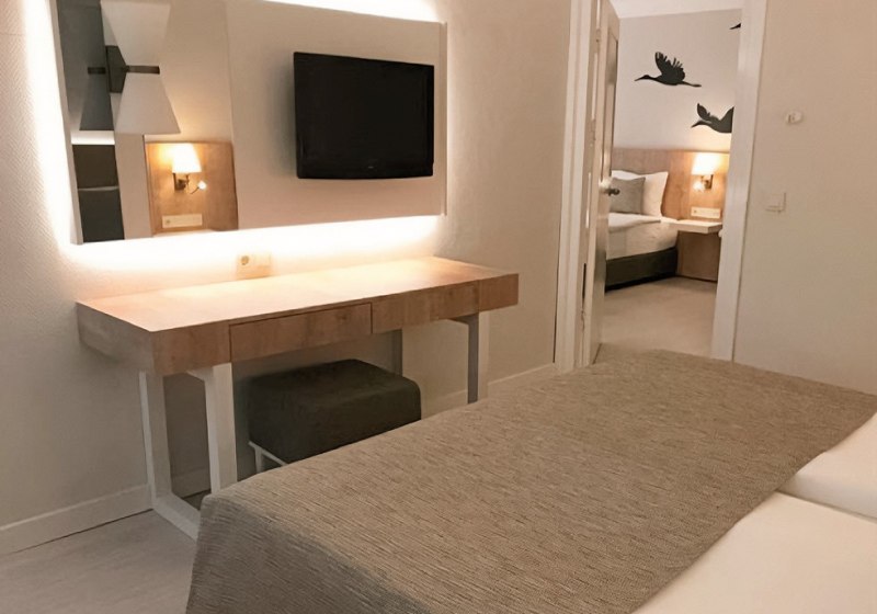 Für Reisende mit größerem Platzbedarf eignen sich die Familienzimmer mit Verbindungstür. Babybetten sind auf Anfrage verfügbar. Die ruhige Farbgebung und der klare Grundriss erleichtern das Ankommen. So wird das Zimmer zur verlässlichen Basis zwischen Strand, Pool und Abendprogramm. Highlight: Balkon als privater Rückzugsort.