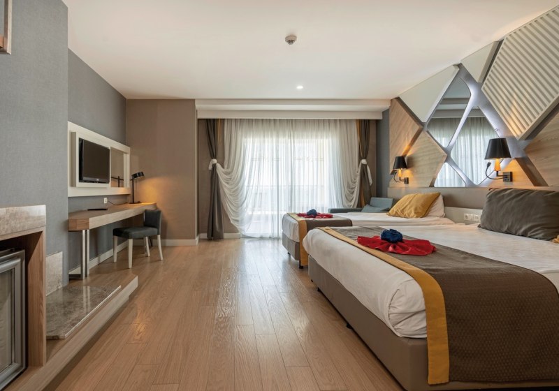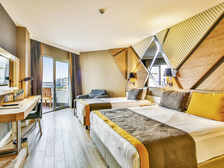Im Saturn Palace Resort wohnt Ihr direkt am Strand von Lara und spürt vom ersten Moment die entspannte Dynamik eines voll ausgestatteten Resorts. Weitläufige Außenbereiche mit Garten, Sonnenterrassen und Pools, dazu ein Aquapark mit vier Wasserrutschen, formen einen lässigen Rhythmus aus Baden, Spielen und Pausen im Schatten. Die Atmosphäre bleibt familiär, ohne an Lebendigkeit zu verlieren.