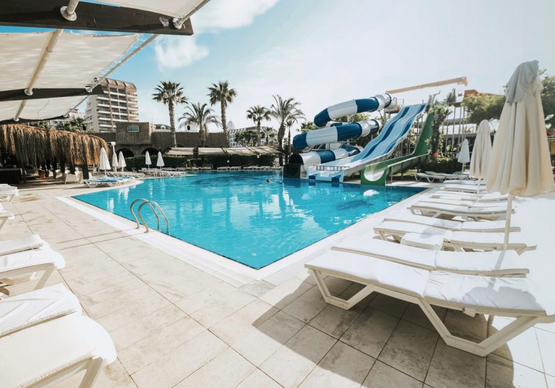 • Liegestühle • Außenpool • Sonnenschirme • Poolbar • Sonnenterrasse • Badetücher • Wasserrutsche