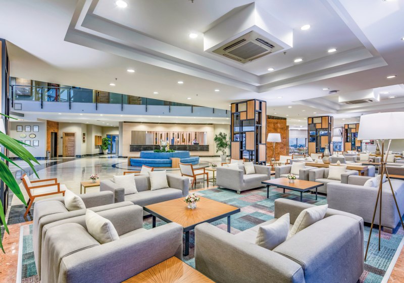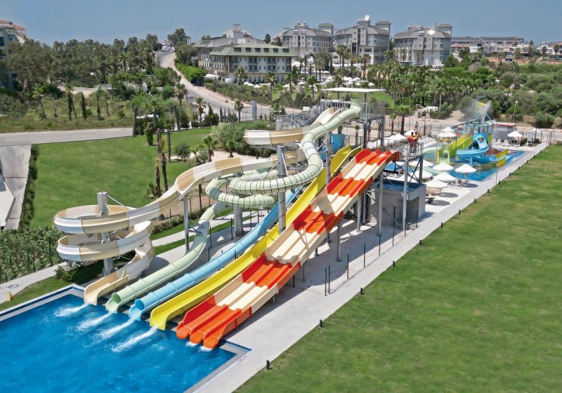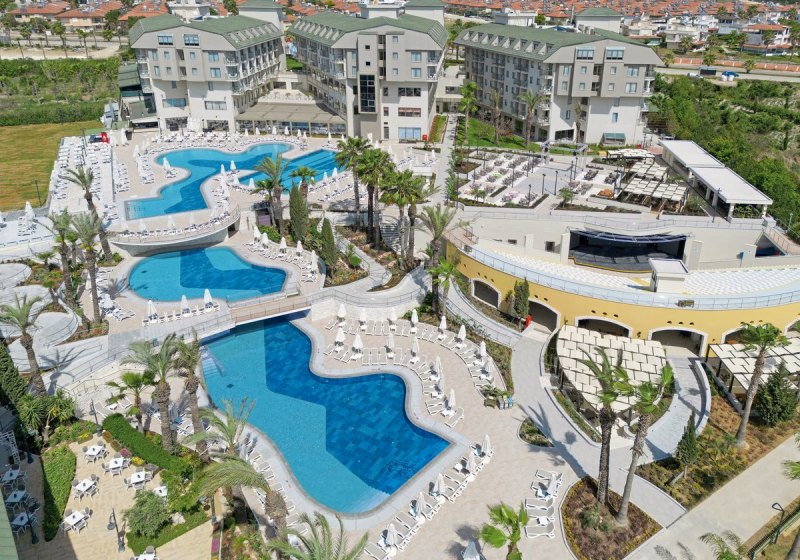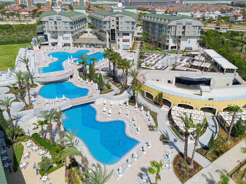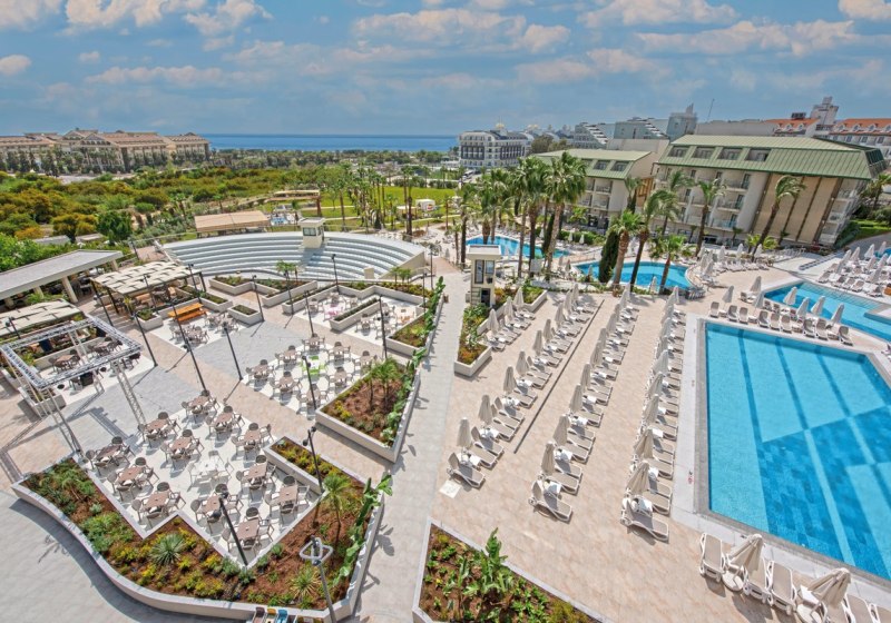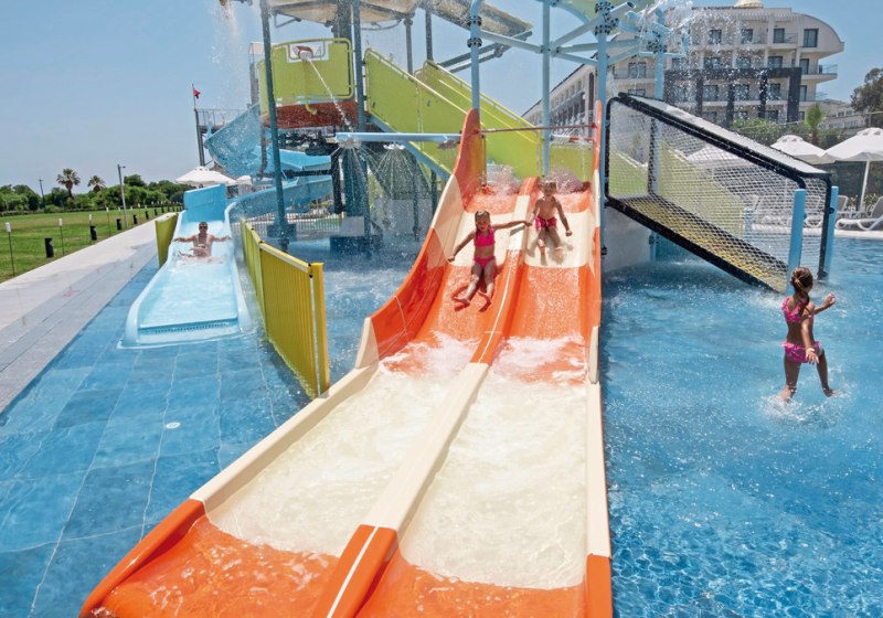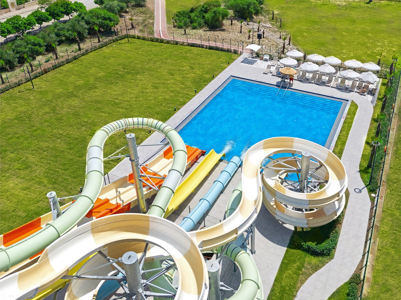 Die Anlage gliedert sich in Lobby, Rezeption und ruhige Sitzbereiche mit WLAN. Geschäfte, Friseur und eine Sat-TV-Lounge ergänzen die Infrastruktur. Draußen dominieren ein großer Außenpool, ein separates Kinderbecken und ein Relaxpool. Herzstück ist der Aquapark mit sieben Wasserrutschen und Mini-Aquatower.
