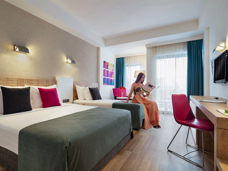• Klimaanlage • Balkon (je nach Zimmerkategorie) • Kühlschrank • Haartrockner • Minikühlschrank • Minibar • Telefon • Safe • Meerblick (je nach Zimmerkategorie) • Raucherzimmer • Kaffee-/Teezubereiter • Terrasse • Fernseher (Sat-TV) • rollstuhlgerechte Zimmer (auf Anfrage) • WiFi (gegen Gebühr)