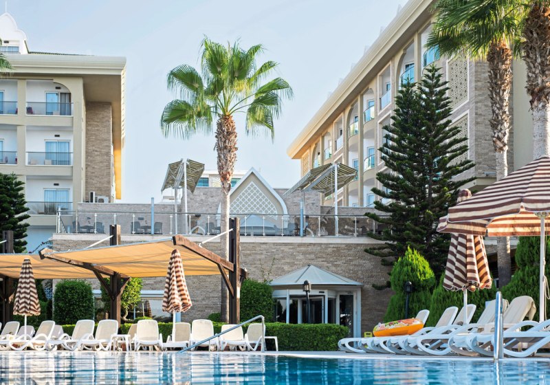 Im Adalya Bliss - Adults Only erwartet Euch eine ruhige, erwachsenenfokussierte Atmosphäre direkt an der Strandpromenade von Side. Zwei fünfstöckige Gebäude sind über die Lobby verbunden und wirken durch klare Strukturen und kurze Wege angenehm übersichtlich. Ihr bewegt Euch zwischen Empfangshalle mit Sitzecken, sonnigen Terrassen und dem Süßwasser-Außenpool mit Wasserrutschen – stets mit stabilem WLAN in der gesamten Anlage.