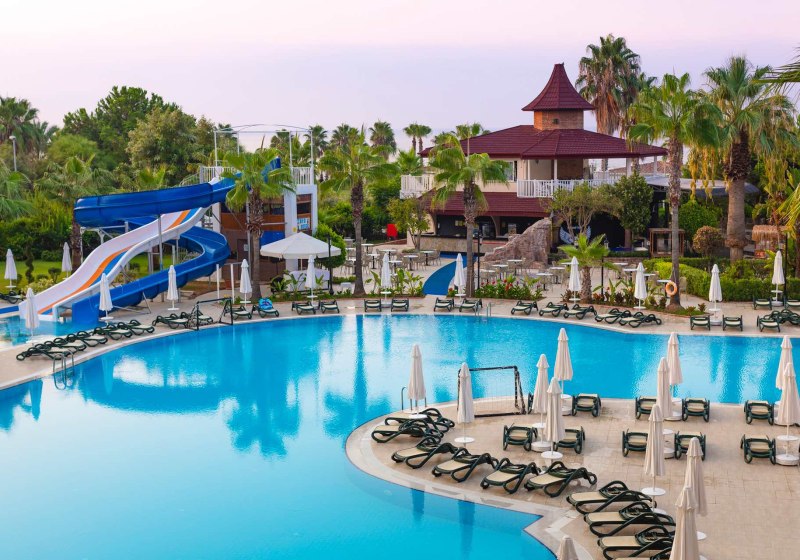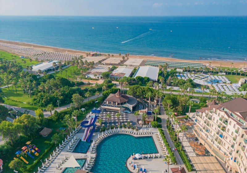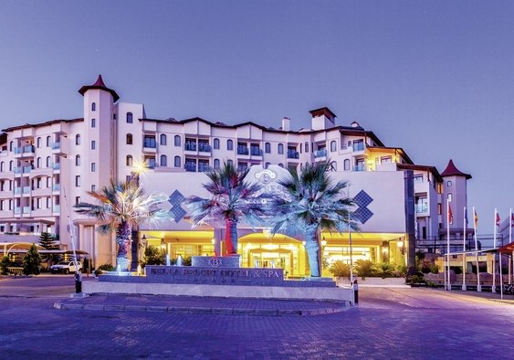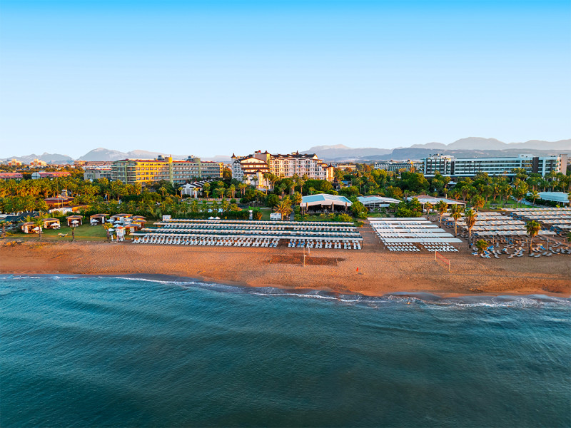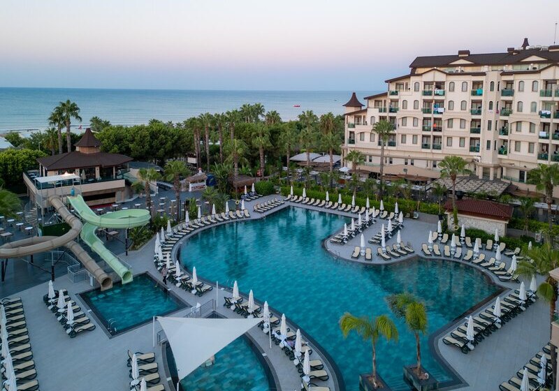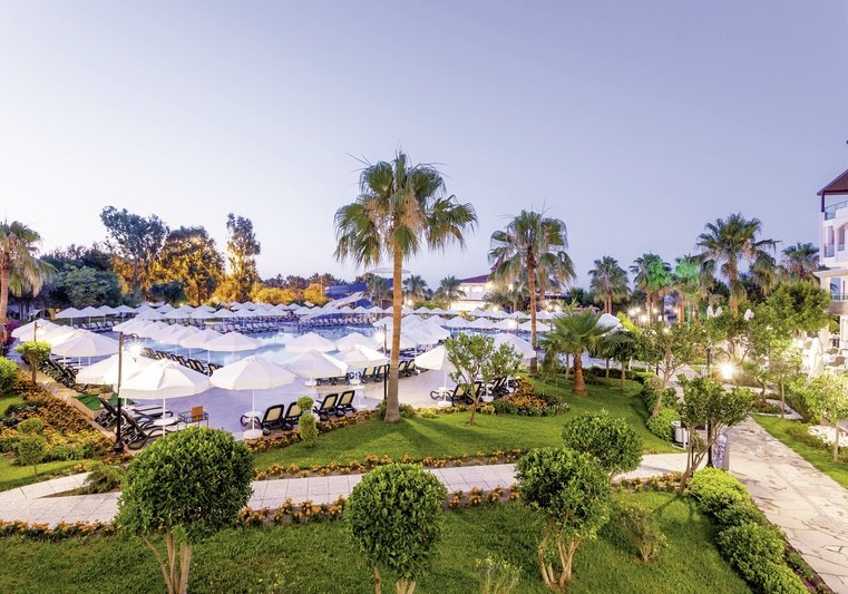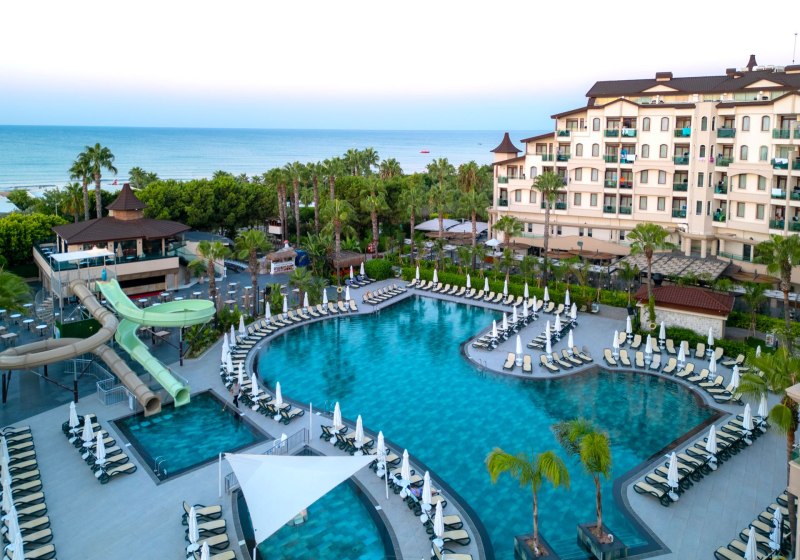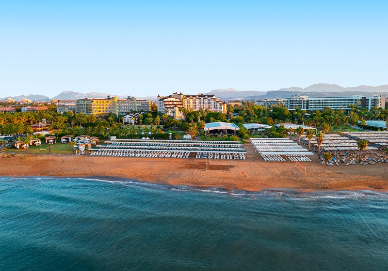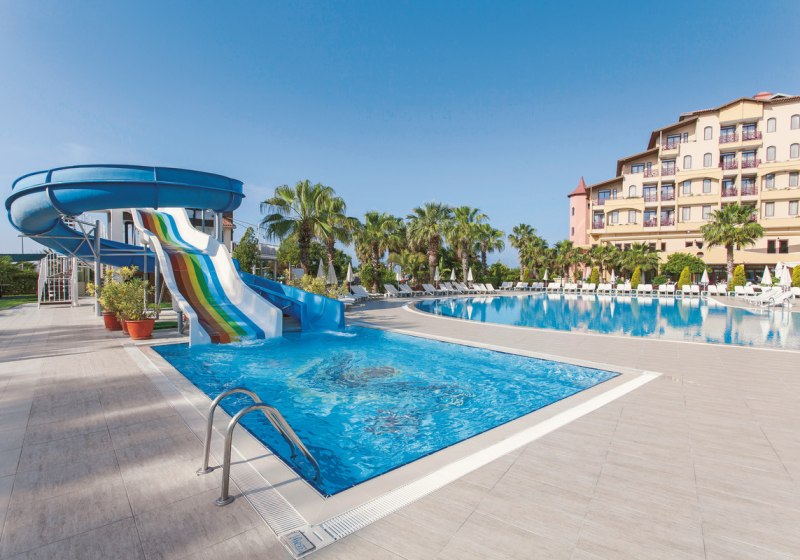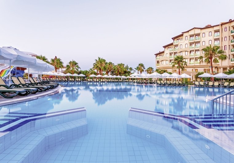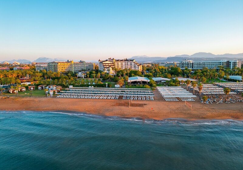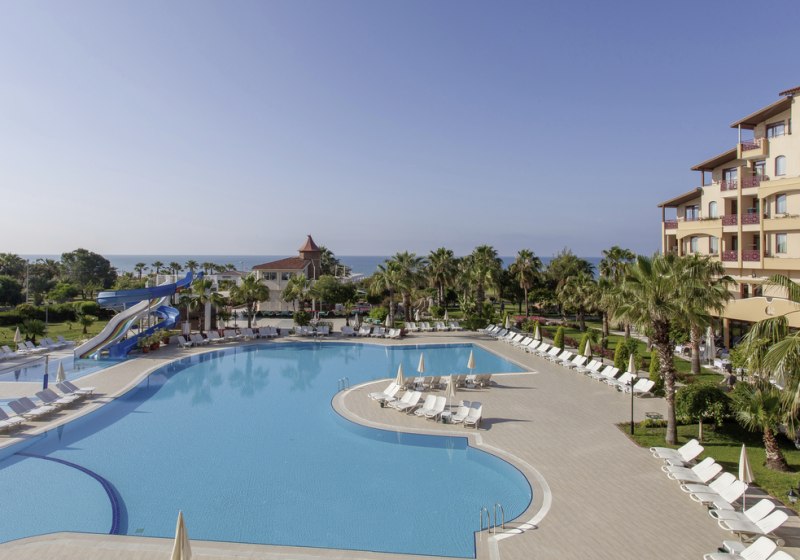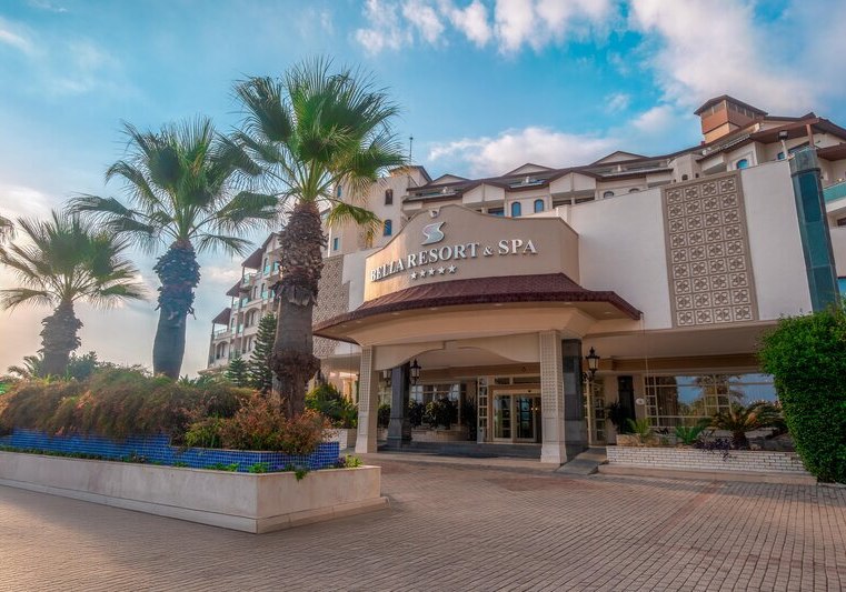 Im Bella Resort & Spa wohnt Ihr in einem Strandhotel mit fünf offizieller Kategorie, gebaut im Jahr 2001 und mit sechs Etagen. Die weitläufige Anlage in Colakli trennt lediglich eine Promenade vom Sandstrand. Zwei Außenpools mit Wasserrutschen und ein separates Kinderbecken setzen lebendige Akzente, während Hallenbad, Spa-Bereich und Garten ruhige Momente ermöglichen.