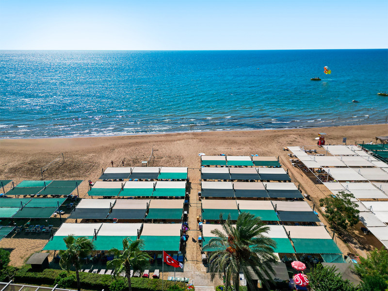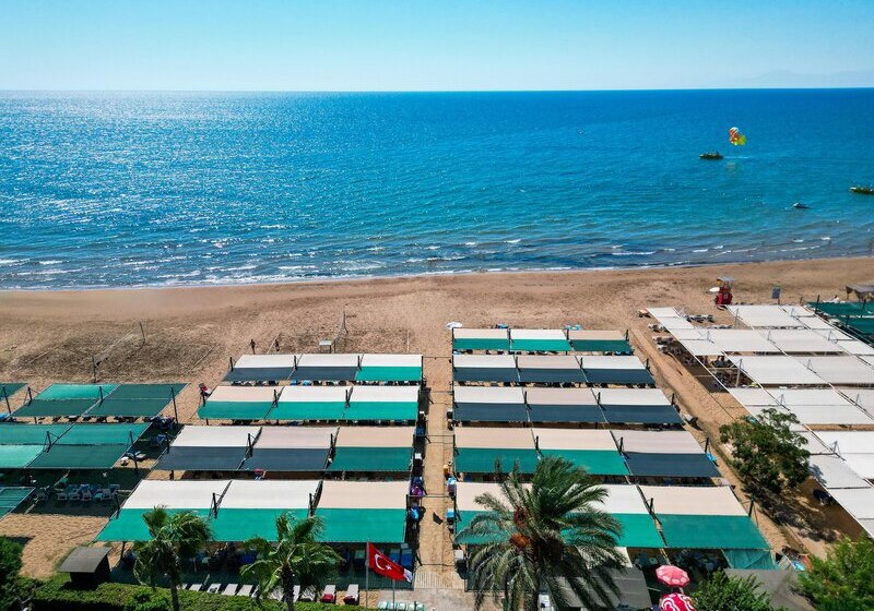 Ihr wohnt in Kumköy direkt am Sandstrand, was die Wege angenehm kurz macht. Zwei Strandbars versorgen Euch unmittelbar an der Küste, Liegen und Schirme sind am Strand und am Pool verfügbar. Das antike Side liegt etwa vier Kilometer entfernt; ideal, wenn Ihr zwischen Strandstunden und kurzem Abstecher in historische Kulissen wechseln möchtet. Die Umgebung wirkt strandnah belebt, das Hotel bleibt dabei klar strukturiert.