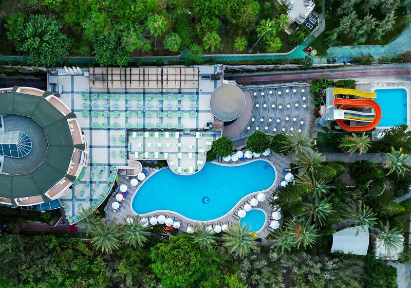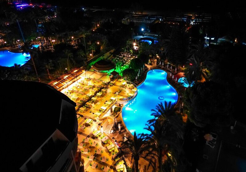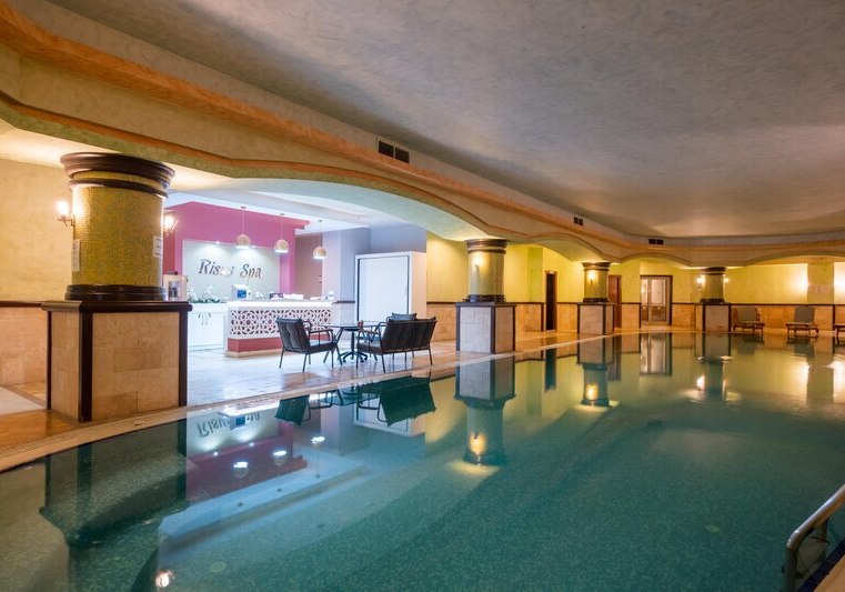 Das Herzstück bilden Süßwasser-Außenpool, drei Wasserrutschen und eine breite Sonnenterrasse mit Liegen, Schirmen und Badetüchern – am Pool wie am Strand. Ein Hallenbad ergänzt an kühleren Tagen. In der Empfangshalle mit Rezeption, Lobbybereichen und Shops wirkt das Haus übersichtlich; WLAN ist im gesamten Hotel verfügbar.