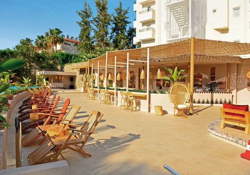 Ihr startet entspannt auf der Sonnenterrasse, wechselt zur Poolbar, später auf die Restaurantterrasse – die Wege sind kurz, die Atmosphäre angenehm belebt. Der hoteleigene Sandstrand liegt etwa 400 Meter entfernt, per Shuttle oder kurzer Spaziergang bequem erreichbar. Abends füllt sich der Theatersaal, Live-Musik setzt Akzente, während Ihr auf der Terrasse den warmen Abend ausklingen lasst.