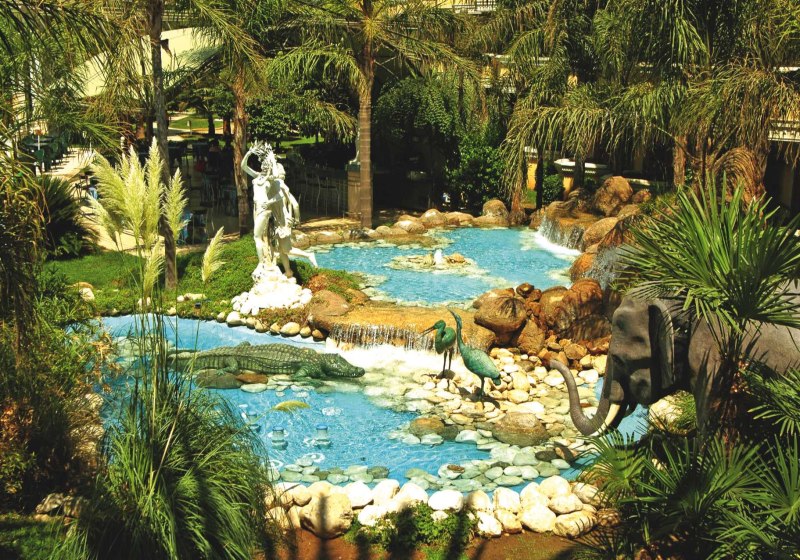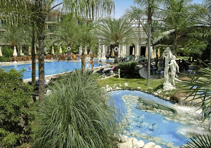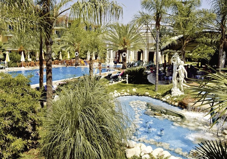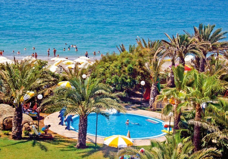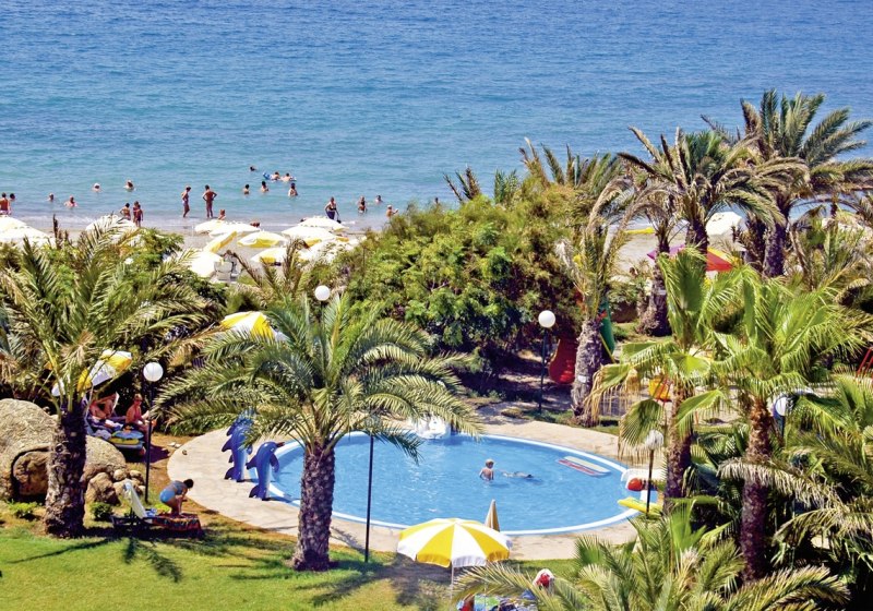 Das Gelände bündelt viele Bereiche auf kurzen Wegen: Rezeption, Empfang, WLAN in den öffentlichen Zonen, TV-Raum und Geschäfte bis hin zum kleinen Supermarkt. Rund um den Außenpool mit Kinderbecken, Wasserrutsche, Liegen und Sonnenschirmen liegt eine Terrasse mit Handtuchservice. Die Poolbar sowie eine Snackbar sorgen für Versorgung ohne Umwege.