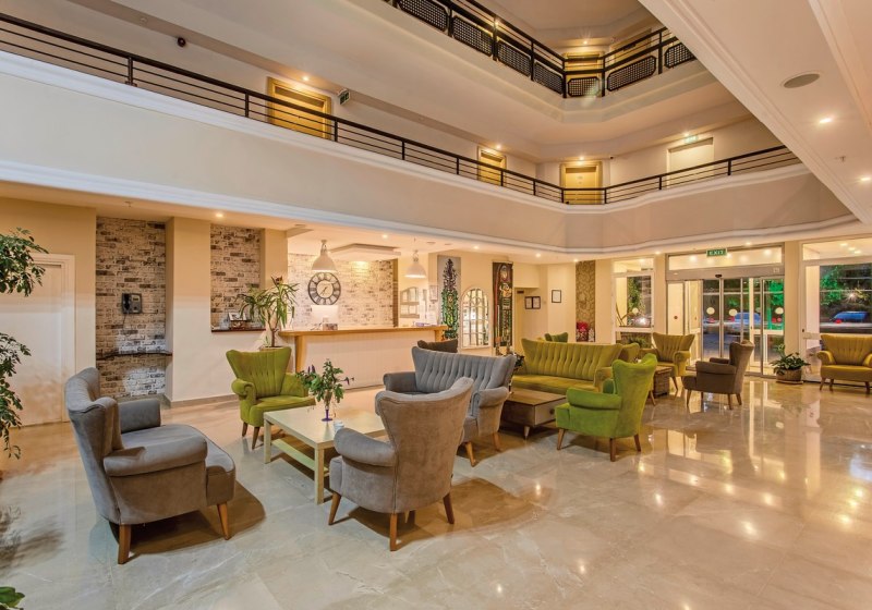 Im Incekum Su Hotel wohnt Ihr in Avsallar direkt am Kies- und Sandstrand – kompakt, nah am Geschehen und mit kurzen Wegen. Das Ensemble aus einem sechsstöckigen Hauptgebäude und sieben dreistöckigen Gartenhäusern wirkt übersichtlich, mit klar strukturierten Bereichen für Ruhe, Badetag und Aktivität. Die Lobby mit Rezeption und Sitzgelegenheiten bildet den Treffpunkt; hier nutzt Ihr WLAN inklusive. Draußen wartet der Süßwasserpool mit separatem Kinderbecken, dazu Liegen, Sonnenschirme und Badetücher inklusive.
