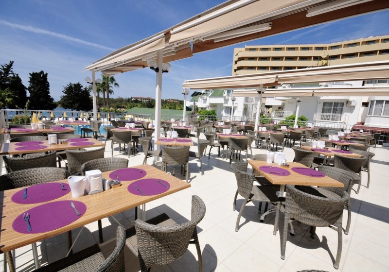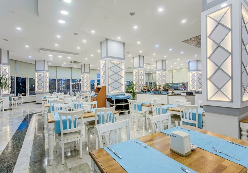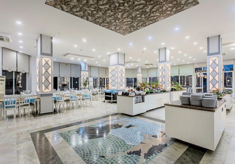 Im Buffetrestaurant mit Terrasse esst Ihr all inclusive: Frühstück, Mittag- und Abendessen sowie Snacks, dazu alkoholfreie und alkoholische Getränke. Live-Kochen bringt Abwechslung an die Stationen und sorgt für frische, direkte Zubereitung. Der Service wird in den Bewertungen als hervorragend beschrieben, das Essen insgesamt als sehr gut.