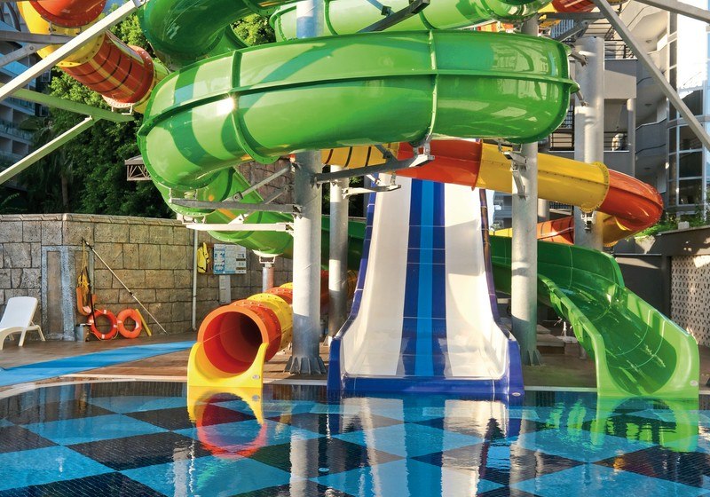 Das Hotel besteht aus Haupt- und Nebengebäude mit jeweils sechs Etagen und zählt 365 Zimmer. In der Empfangshalle mit Rezeption, Wi‑Fi und Sitzbereichen plant Ihr Eure Tage. Shops, Friseur und ein Konferenzraum ergänzen die Infrastruktur. Draußen bilden zwei Außenpools das Herzstück, flankiert von drei Wasserrutschen und einem separaten Kinderpool.