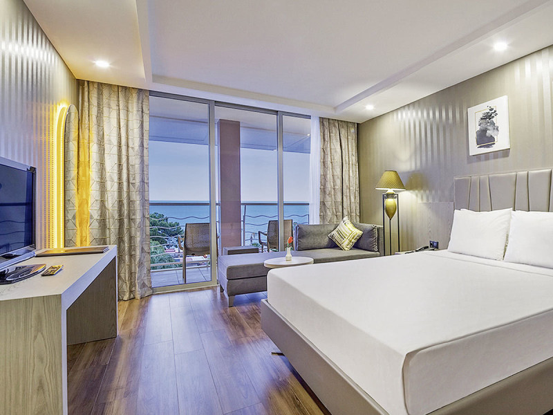 Eure Zimmer bieten Dusche, WC, Föhn, Satelliten-TV mit Musiksender, Direktwahl-Telefon, zentral gesteuerte Klimaanlage, Safe, Minibar und Wasserkocher. Der Boden ist je nach Kategorie in Teppich oder Laminat ausgeführt, alle Zimmer verfügen über einen Balkon. Für den Ausblick bucht Ihr seitliche oder direkte Meerblick-Optionen.