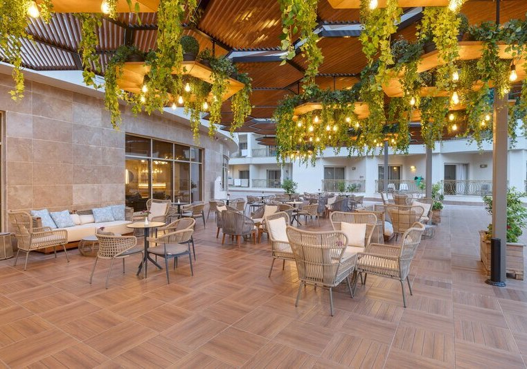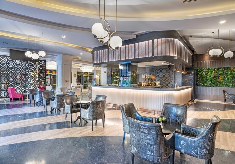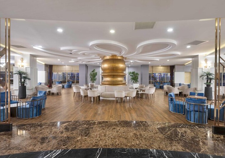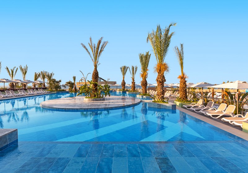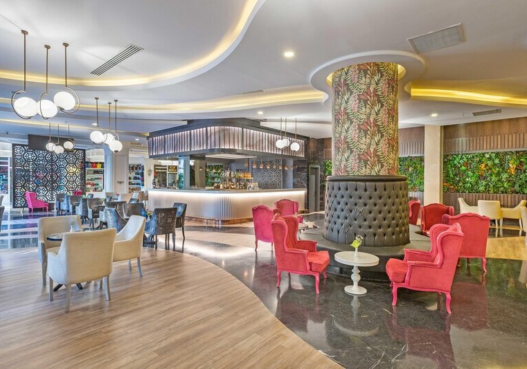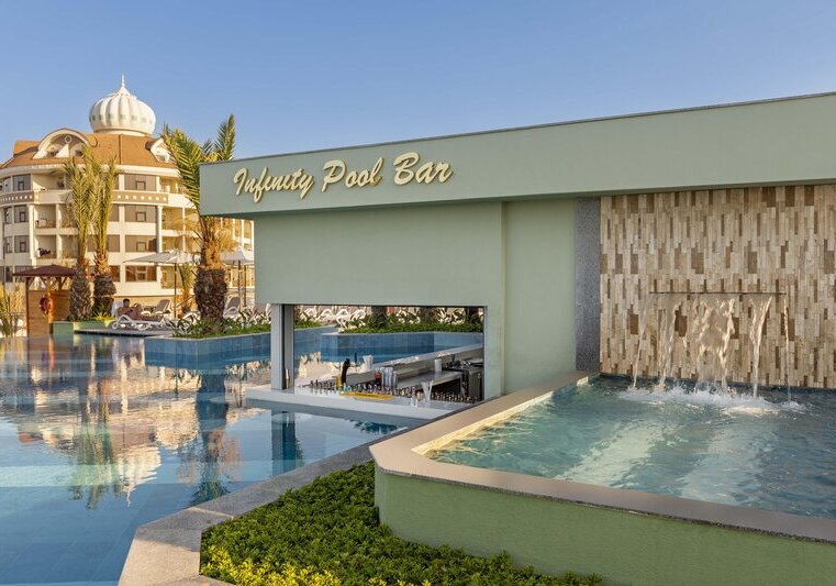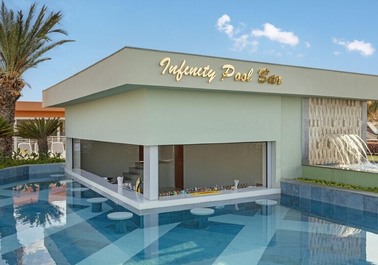 Die großzügige Anlage bietet eine Empfangshalle mit Lobbybar und kostenfreies Wi‑Fi. Shops und ein Friseur ergänzen die Infrastruktur, Sonnenterrassen und Außenmöbel verteilen sich rund um die Pools. Der Aquapark mit acht Rutschen und der Aquatower mit sechs Kinderrutschen sind klarer Anziehungspunkt, dazu kommen Süßwasser-Pool und Infinitypool für ruhige Bahnen.