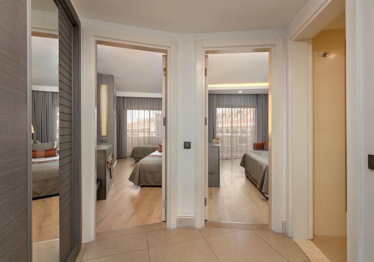 Für mehr Platz wählt Ihr Familienzimmer mit zwei Schlafzimmern und Verbindungstür; teilweise stehen zwei TVs bereit. Einige Zimmerkategorien bieten unterschiedliche Ausblicke, von Pool- bis Meerseite, je nach Verfügbarkeit und Buchung. Die klare Linienführung unterstützt den aufgeräumten Eindruck. Highlight: Familienzimmer mit zwei Schlafräumen und praktischer Verbindungstür.
