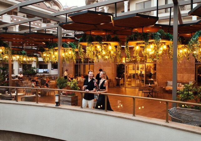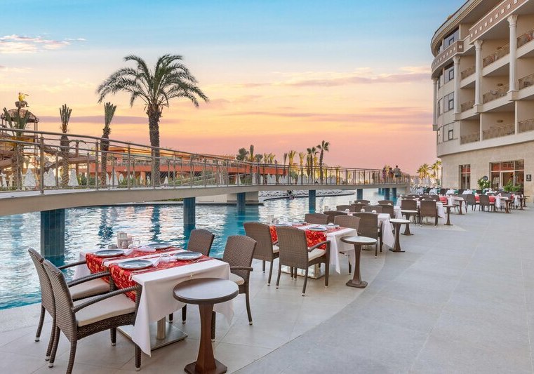 Im Kirman Belazur Resort & Spa erlebt Ihr einen lebendigen Strandaufenthalt direkt am Sand- und Kiesufer von Belek-Bogazkent. Weitläufige Außenbereiche mit Süßwasser-Pool, Infinitypool und einem großen Aquapark prägen die Szenerie. Die Anlage verteilt sich auf Haupt- und Nebengebäude, sodass Ihr zwischen ruhigen Ecken und aktiven Zonen mühelos wechselt. Familien schätzen den Aquatower mit Kinderrutschen, Paare die Abende mit Livemusik und die Bar am Pier.