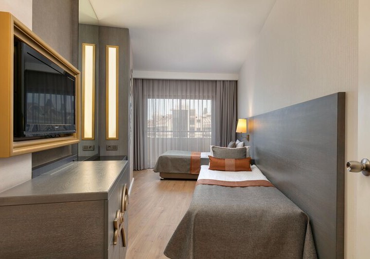 Eure Zimmer sind funktional und angenehm dimensioniert, mit etwa 29 Quadratmetern, Laminatboden und Balkon. Ein Doppel- und ein Einzelbett, Dusche/WC, Safe, Minibar und Wasserkocher gehören zur Grundausstattung, ebenso Wi‑Fi und zentral gesteuerte Klimaanlage. So richtet Ihr Euch schnell ein, vom Morgenkaffee bis zum abendlichen Rückzug nach Strand und Show.