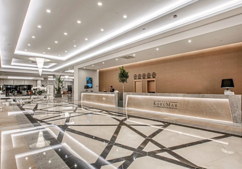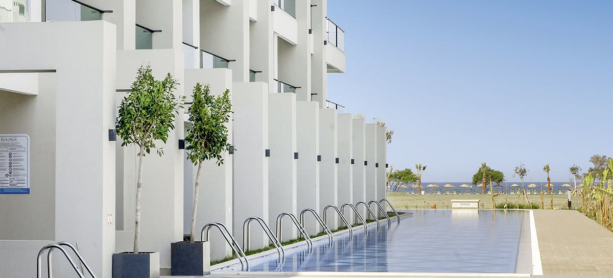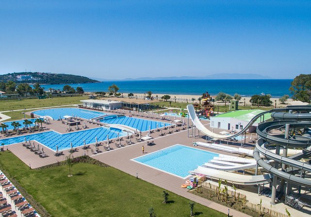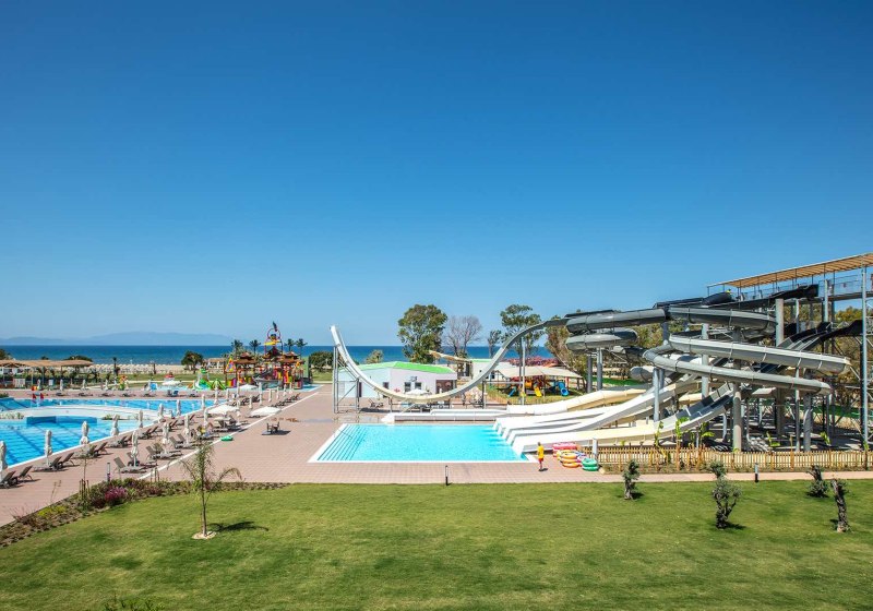 Im Korumar Ephesus Beach & Spa Resort wohnt Ihr direkt am feinsandigen, flach abfallenden Strand von Pamucak und spürt vom ersten Schritt an die weiträumige Gestaltung: zwei verbundene Gebäude, ein Nebengebäude, drei Etagen und kurze Wege zu Pool, Garten und Strand. Die Atmosphäre ist lebhaft, aber strukturiert – ideal, wenn Ihr klare Angebote schätzt, vom Wasserpark mit Rutschen bis zur ruhigen Lobbyterrasse. Familien, Strandliebhaber und Aktive finden ebenso ihren Platz wie Kulturreisende, die die Nähe zu Kusadasi nutzen.