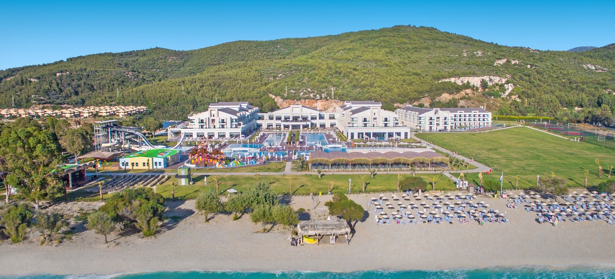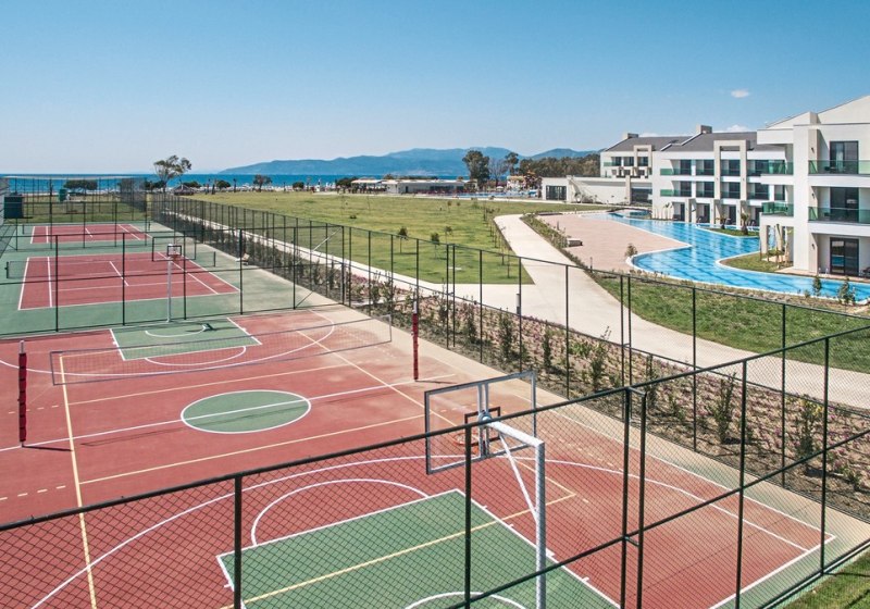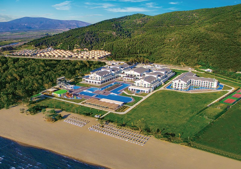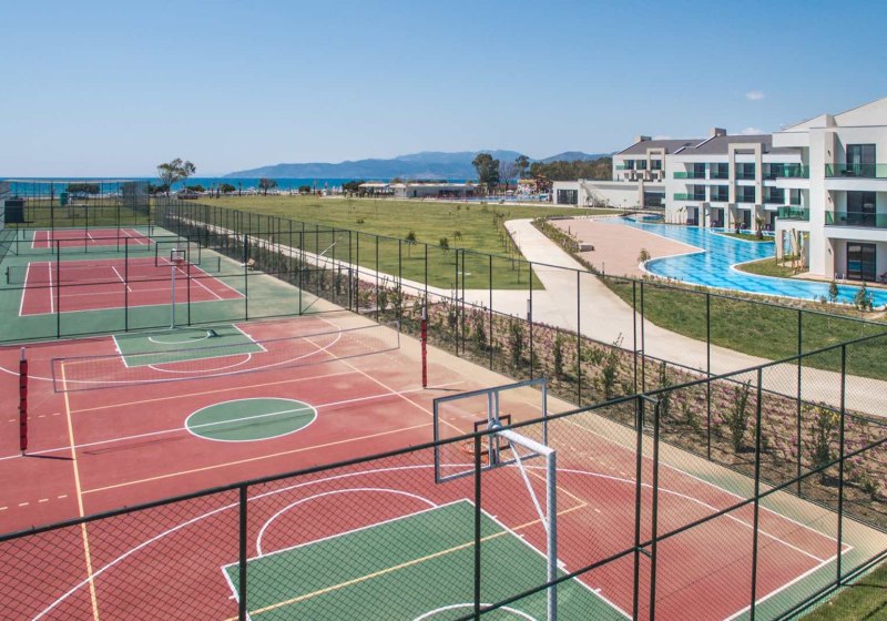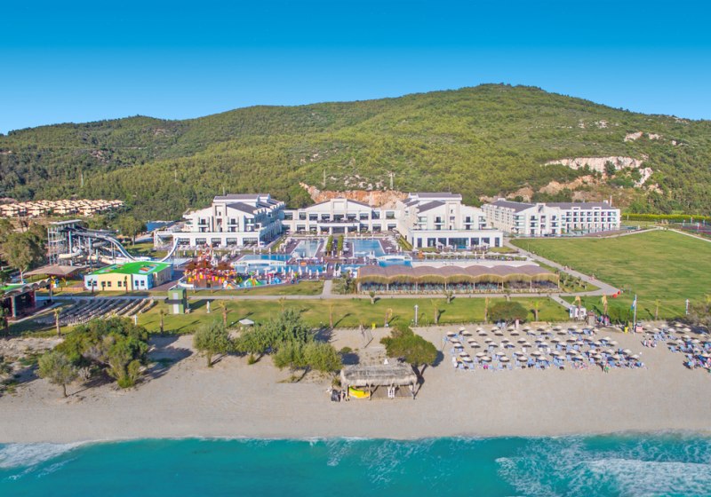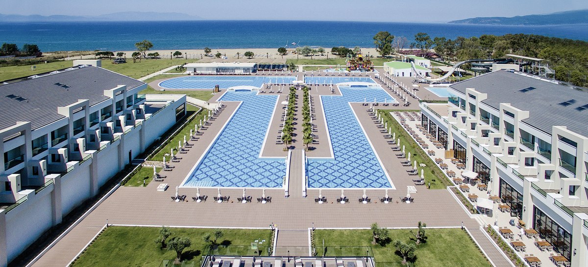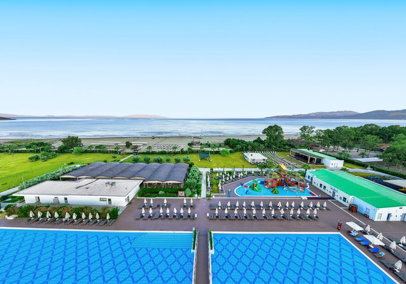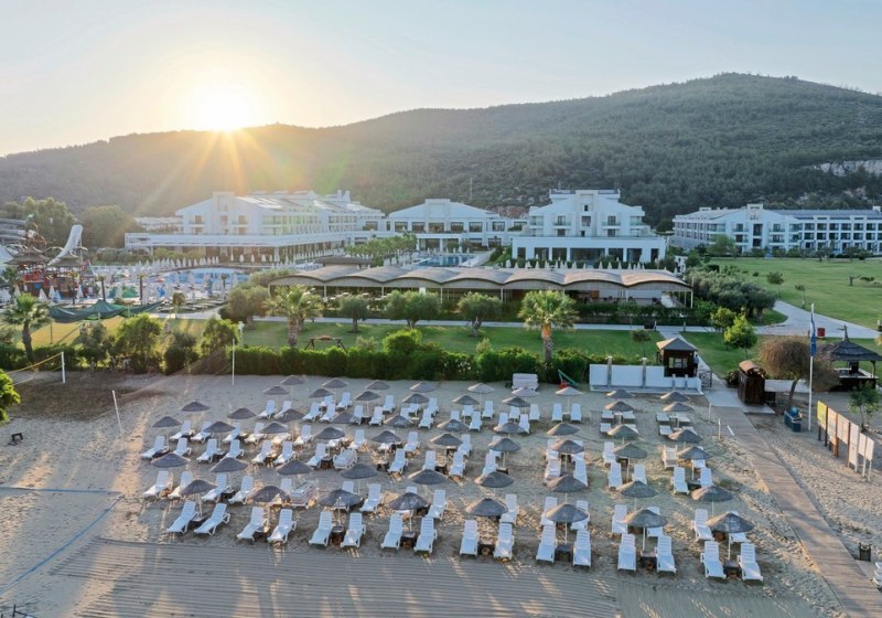 Korumar Ephesus Beach & Spa Resort kombiniert direkte Strandlage, klare Strukturen und breite Angebote: All-Inclusive mit Spezialkost, starke Bewertungen, familienfreundliche Rutschen und Miniclub, dazu Sport von Tennis bis Wassersport. Die Zimmerauswahl reicht von Swim-up bis Suite – passend für Paare und Familien.