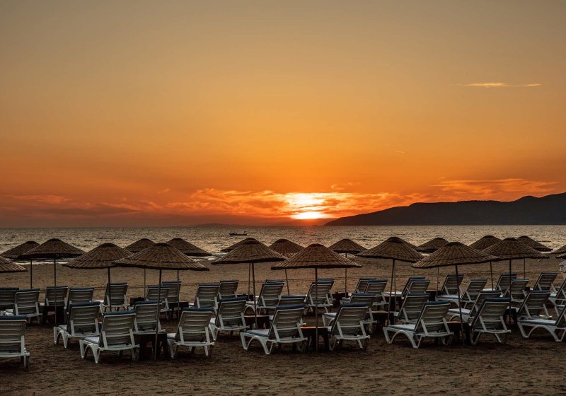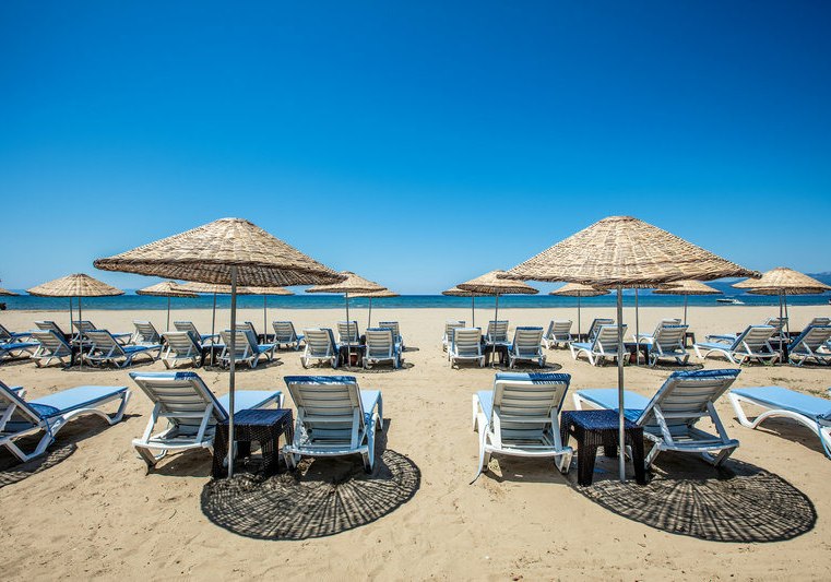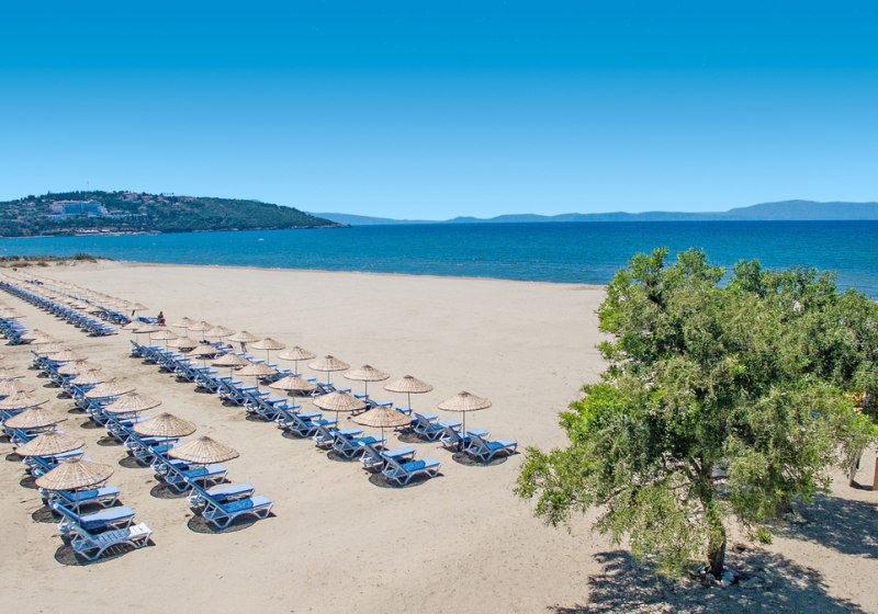 Die Lage ist präzise definiert: direkt am feinsandigen, flach abfallenden Strand von Pamucak, mit Blick und Zugang zum Meer. Bis ins Zentrum von Kusadasi sind es etwa 15 km; öffentliche Minibusverbindungen erleichtern Euch den Transfer zu Stadt, Restaurants und Einkaufsmöglichkeiten. Der Flughafen Izmir (ADB) liegt rund 60 km entfernt. Am Strand profitiert Ihr von Liegen, Sonnenschirmen, Umkleiden, Strandbar und Pavillons. So kombiniert Ihr Strandtage, kurze Wege und spontane Ausflüge in die lebhafte Hafenstadt. Für Kultur- und Shoppingtouren eignet sich die Distanz ebenso wie für entspannte Rückkehr in eine ruhige Strandkulisse. Highlight: Direkte Strandlage mit Infrastruktur – bequem zwischen Meer, Bar und Zimmer wechseln.