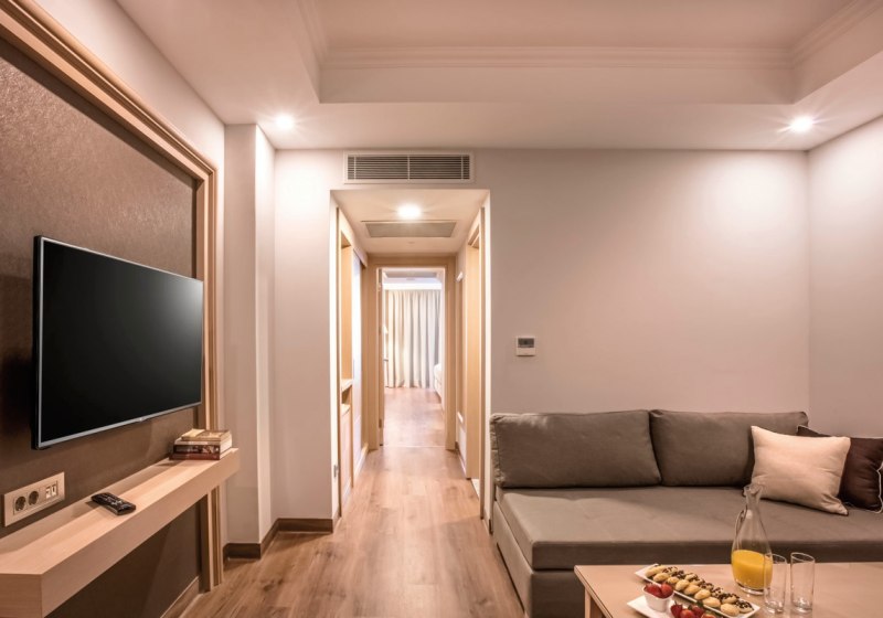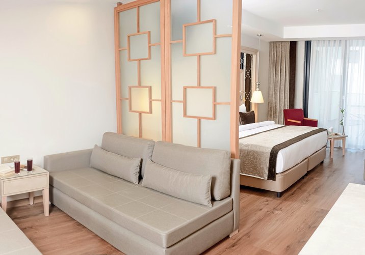 Für Ansprüche an Raum: Familienzimmer mit Schlafzimmer, Wohnzimmer, Verbindungstür und zwei Badezimmern. Juniorsuiten verfügen über eine Jacuzzi-Badewanne, Suiten zusätzlich über Esstisch und zwei Badezimmer. Großen Komfort bieten Zimmer mit direktem Zugang zum Gemeinschaftspool – morgens direkt ins Wasser starten. Großes Doppelzimmer mit Doppelbett und zwei Schlafsofas schafft Platzreserven. Highlight: Swim-up-Option – direkter Poolzugang aus dem Zimmer.