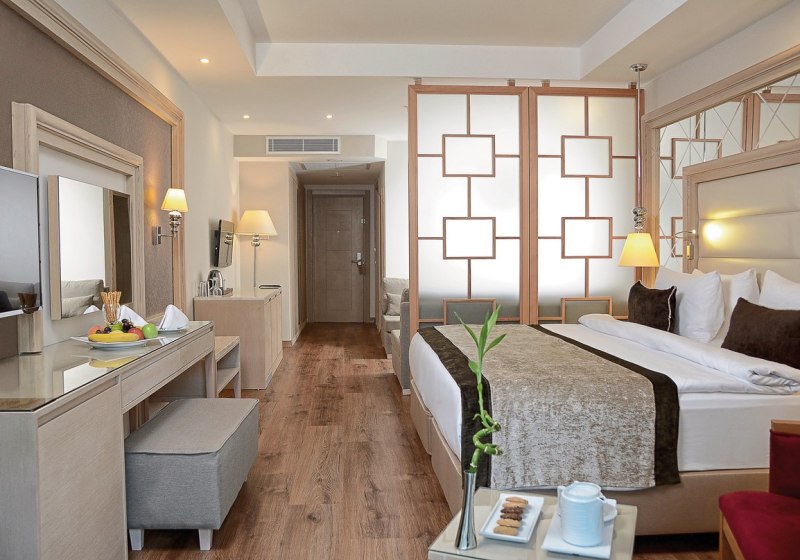 Die öffentlichen Bereiche wirken modern und funktional: WLAN im gesamten Resort inklusive, eine großzügige Süßwasser-Poollandschaft, Hallenbad, Game-Hall und ein Theatersaal. Für Business-Momente stehen Business-Center sowie Konferenz- und Bankettsäle bereit. Am Strand erwarten Euch inklusive Liegen, Sonnenschirme und Badetücher – dazu Strandbar und Pavillons. Kulinarisch wählt Ihr zwischen Buffet mit Terrasse, À-la-carte, Bars, Snack Bar und Patisserie. Highlight: Direkte Strandlage mit flach abfallendem Sand – komfortabler Zugang zum Meer.