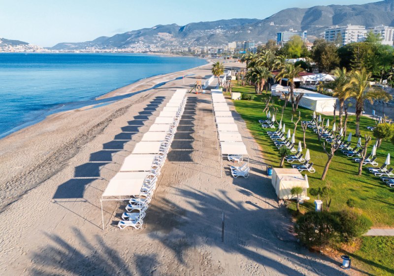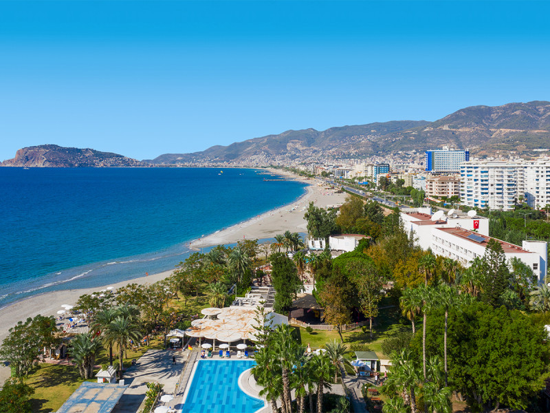Das Labranda Alantur Resort liegt in Kestel, direkt am Sand-Kiesstrand und unmittelbar neben dem Fluss Dim. Bis zum Zentrum von Alanya sind es etwa 6 Kilometer; die Altstadt ist damit bequem erreichbar. Eine Bushaltestelle befindet sich rund 50 Meter entfernt, sodass Ihr flexibel zwischen Strandzeit und Stadtausflug wechselt. Der Zugang zum Meer ist unmittelbar, ohne Straßenquerung.