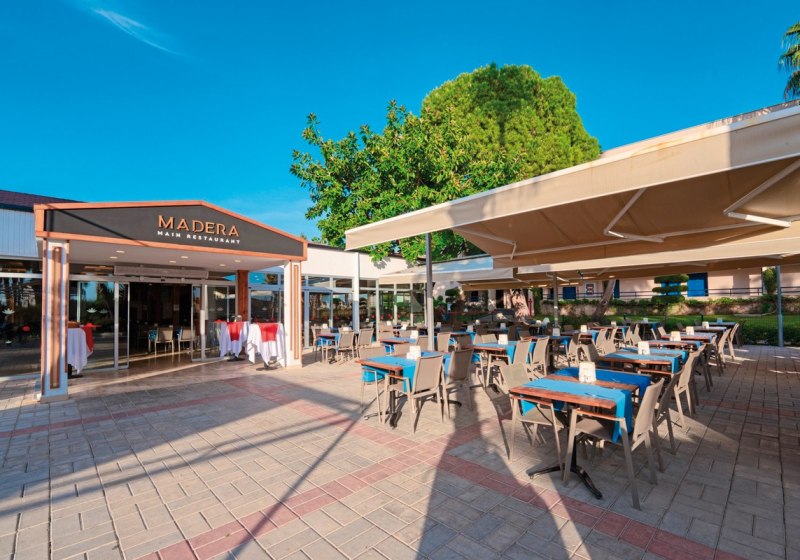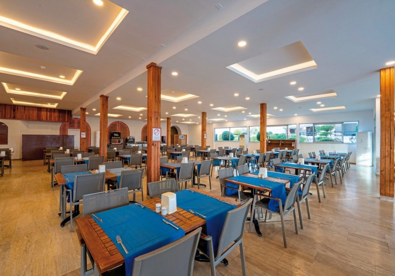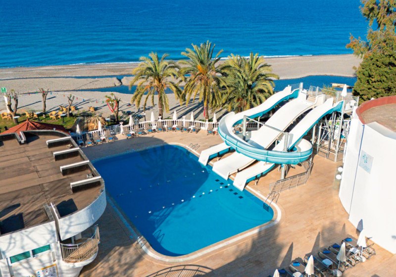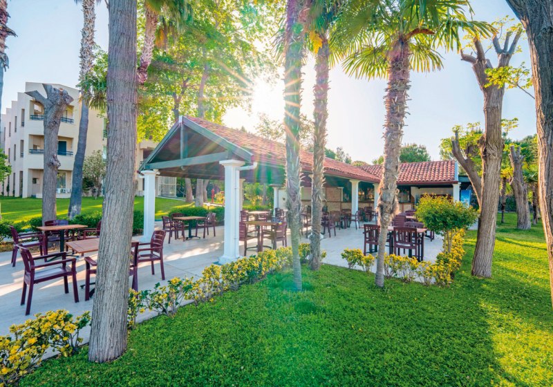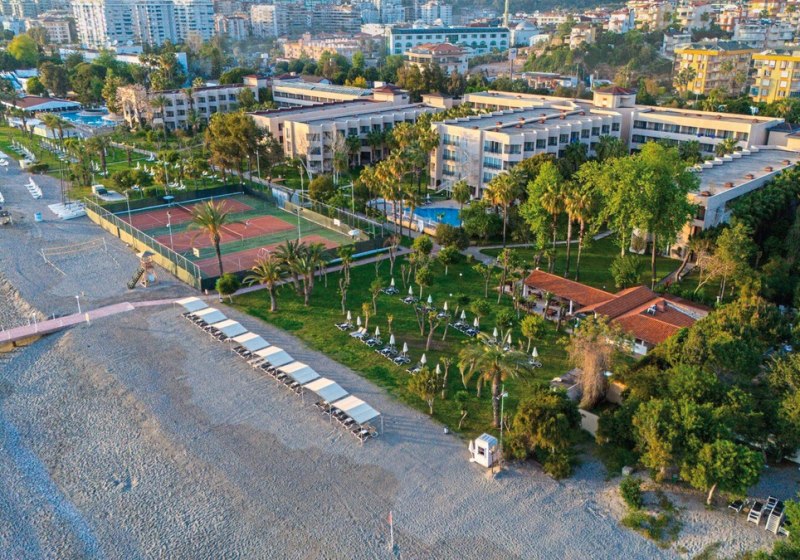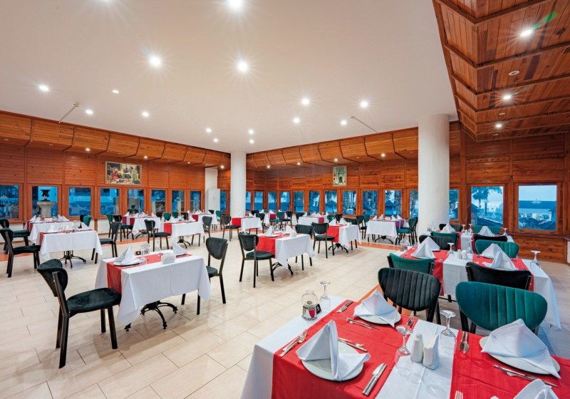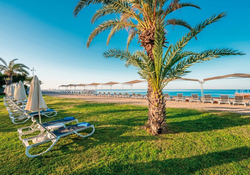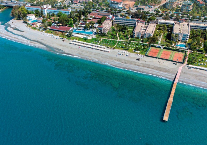Das Herz schlägt tagsüber an Pools mit Rutschen und auf den Sportflächen, abends im Showbereich mit Livemusik und Programmen. Kulinarisch erwartet Euch ein Hauptrestaurant mit Terrasse sowie zwei À-la-carte-Optionen, dazu Bars vom Pool bis zum Strand. WLAN ist im Hotel inklusive, 350 Zimmer verteilen sich auf einen mehrstöckigen Gebäudekomplex mit Liften. Highlight: Direkte Strandlage mit Gartenflair, dazu der Dim-Fluss als markanter Nachbar.