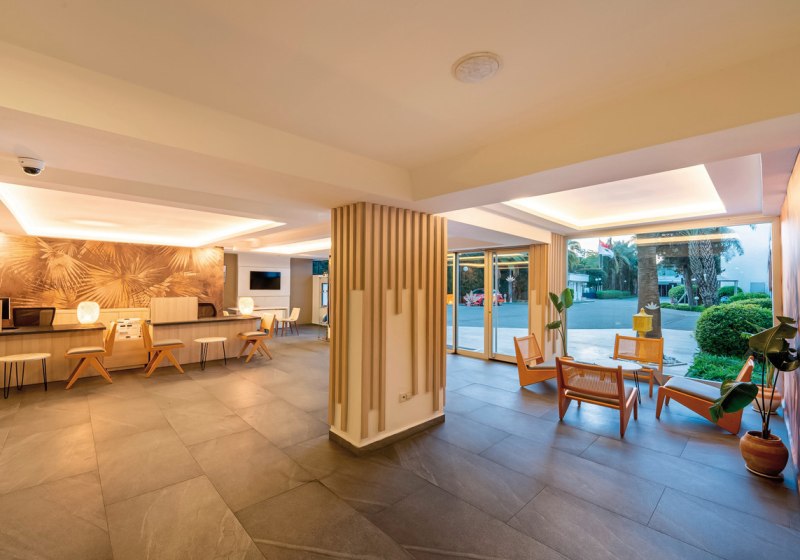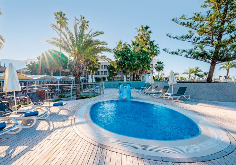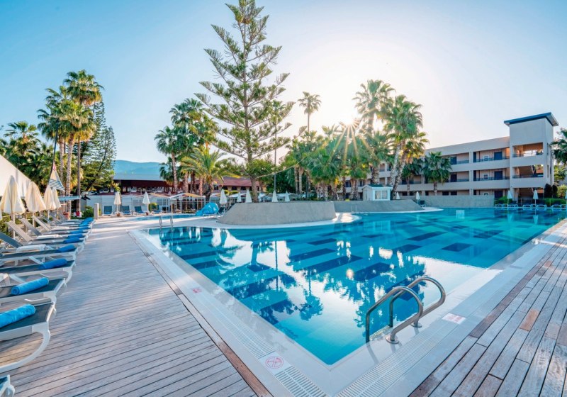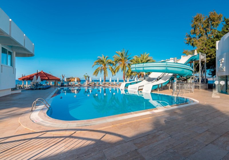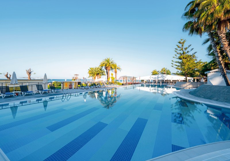 Der mehrstöckige Gebäudekomplex mit Liften bündelt 350 Zimmer, Lobby und Rezeption. WLAN ist im Hotel inklusive. Außen erwarten Euch ein Süßwasserpool, ein Relaxpool ab 16 Jahren sowie ein Pool mit drei Wasserrutschen. Sonnenterrasse, Liegen, Auflagen, Schirme und Badetücher stehen am Pool und am Strand bereit.