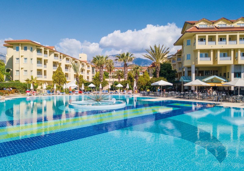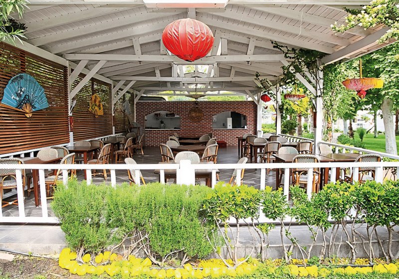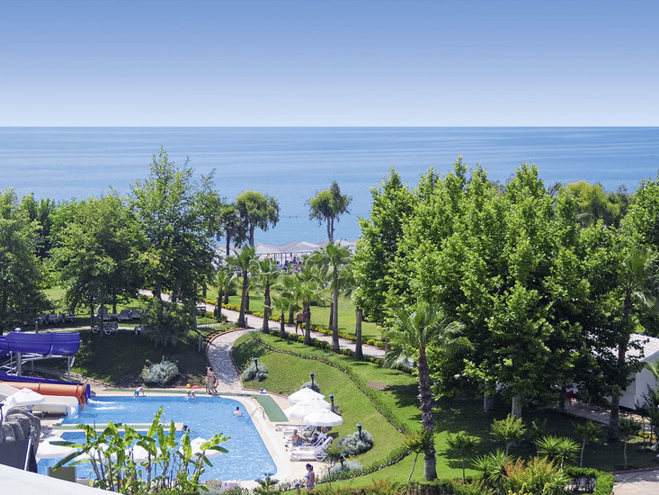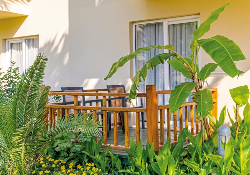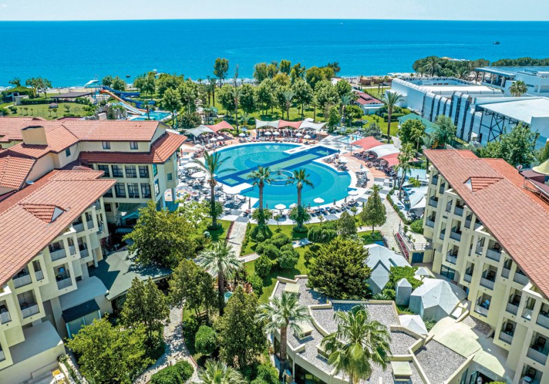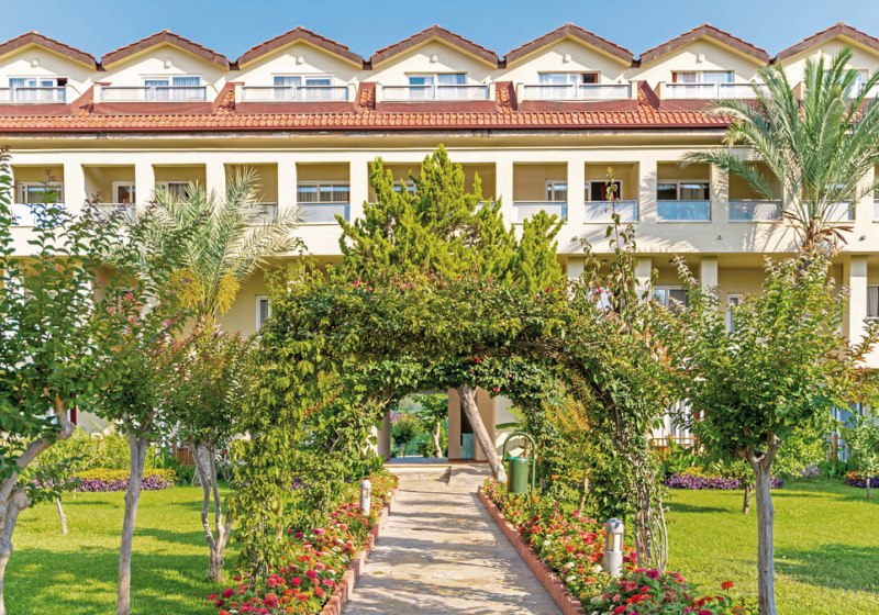 Im Le Jardin Resort trefft Ihr auf ein weitläufiges Strandresort, das klare Strukturen, kurze Wege und viele Rückzugsorte verbindet. Zwischen grünen Flächen, Sonnenterrassen und lebendigen Bereichen mit Pools und Rutschen entsteht ein angenehmer Wechsel aus Aktivität und Ruhe. Familien, Strandurlauber und Wellnessliebhaber finden hier jeweils ihre Zone: der Kiesstrand mit Badesteg, der Wasserpark-Charakter am Pool, das Hallenbad und der Hamam. Die Architektur bleibt moderat in der Höhe, mit drei Etagen im Hauptgebäude und zusätzlichen Nebengebäuden, sodass die Anlage übersichtlich wirkt.