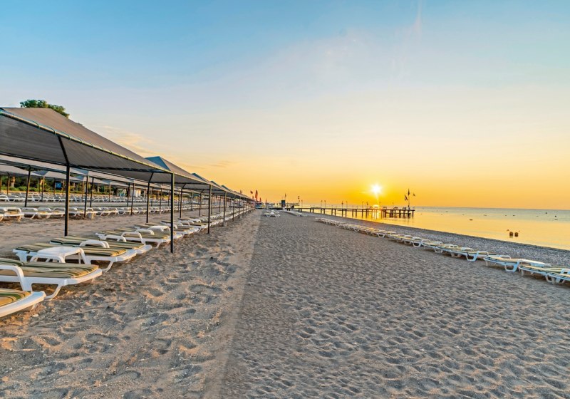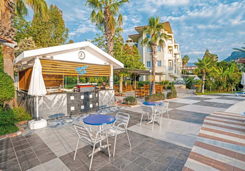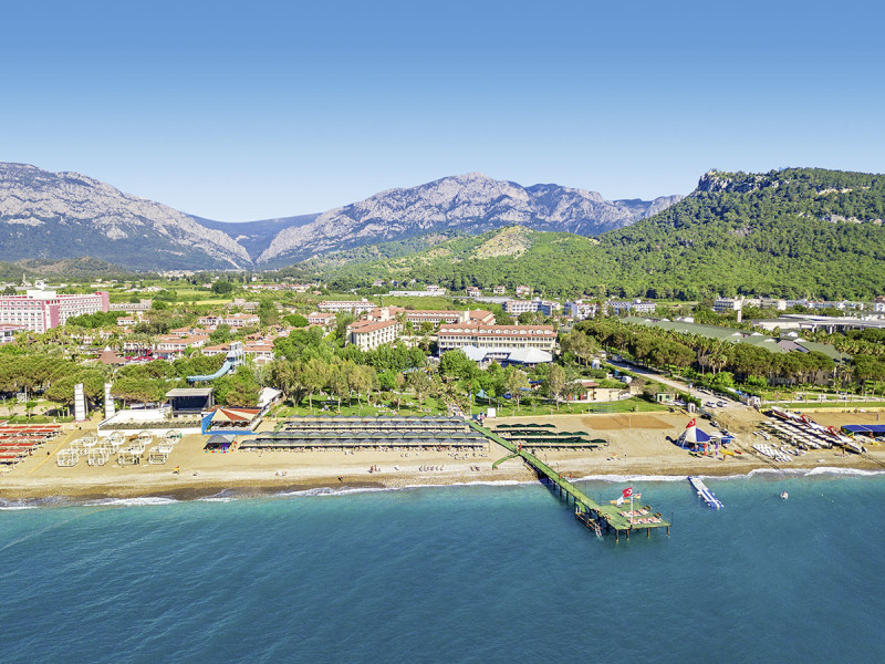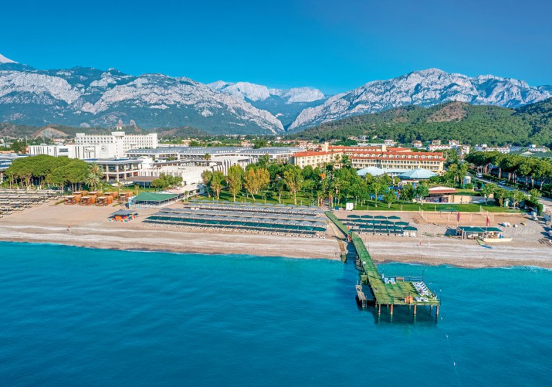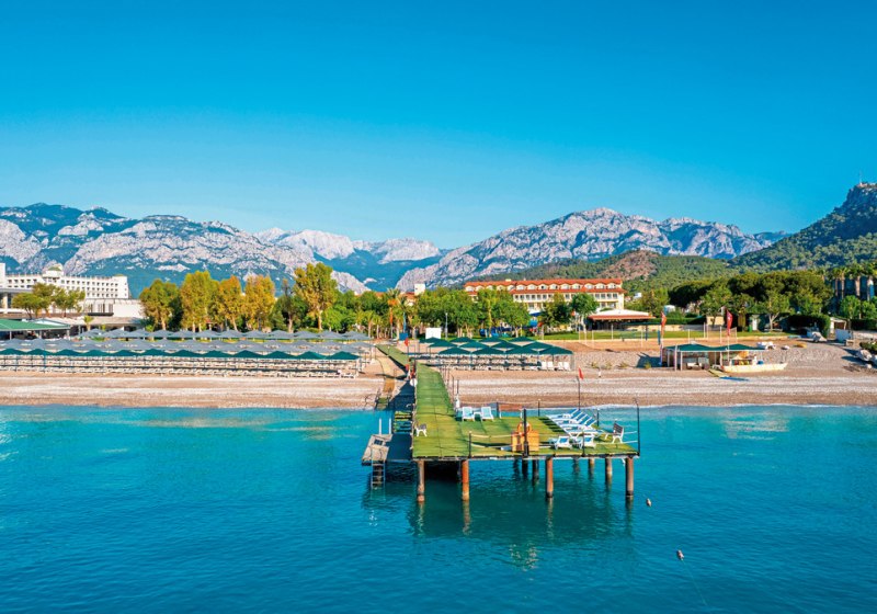 Das Le Jardin Resort liegt in Kiris direkt am Kiesstrand – das Meer beginnt in greifbarer Entfernung, die Distanz wird mit 30 Metern angegeben. Ein Badesteg erleichtert den Einstieg ins Wasser und dient als sonniger Aufenthaltsort. Bis Kemer sind es rund 7 Kilometer; Ihr nutzt Taxi- und Minibus-Verbindungen, um schnell in den Ort oder zurück zur Anlage zu gelangen. Die Lage an der Hauptstrasse sorgt für eine unkomplizierte Erreichbarkeit, gleichzeitig bleibt die Orientierung einfach: Strand, Steg, Poolbereiche und Gartenflächen liegen nah beieinander. Wer lieber auf der Anlage bleibt, findet Beach-Snacks, Liegen und Sonnenschirme direkt vor Ort, ohne zusätzliche Wege.