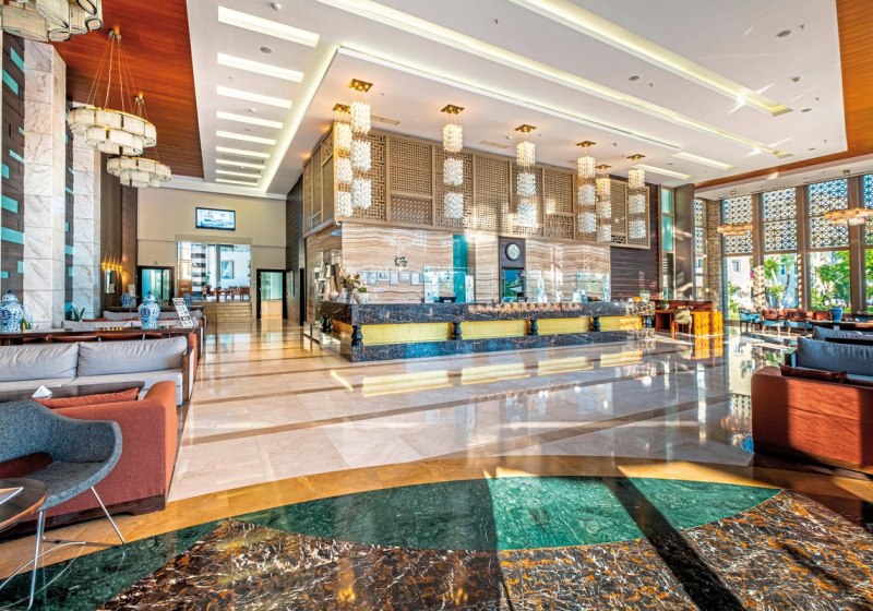 Die öffentlichen Bereiche sind vielfältig strukturiert: Empfangshalle mit 24-Stunden-Rezeption und Sitzgruppen, Lobby-WLAN inklusive, Shops, Friseur, Café und Bibliothek. Sonnenterrassen rahmen den Süsswasser-Pool, ein separater Kinderpool und drei Wasserrutschen erweitern die Wasserflächen. Am Strand warten Liegen, Auflagen, Sonnenschirme und Badetücher auf Euch.