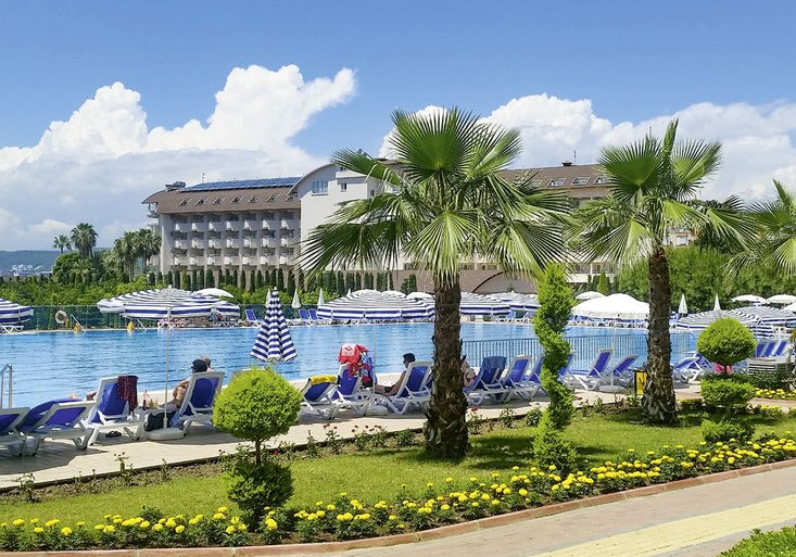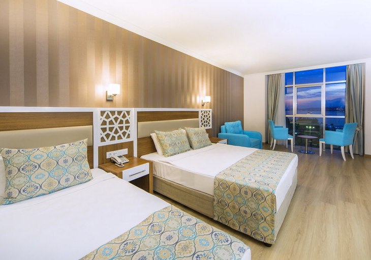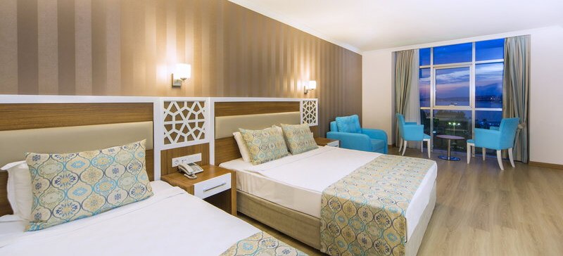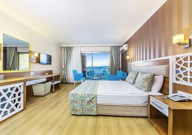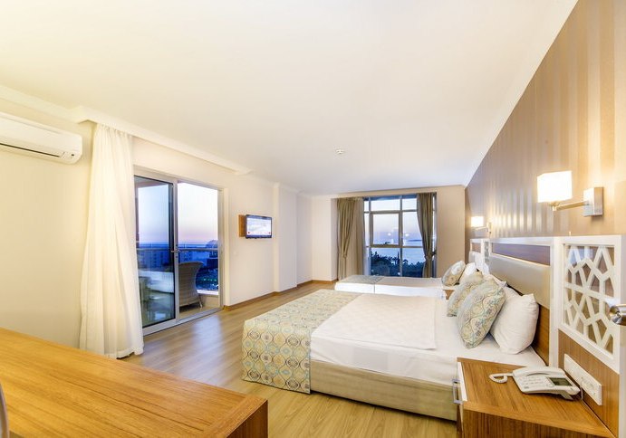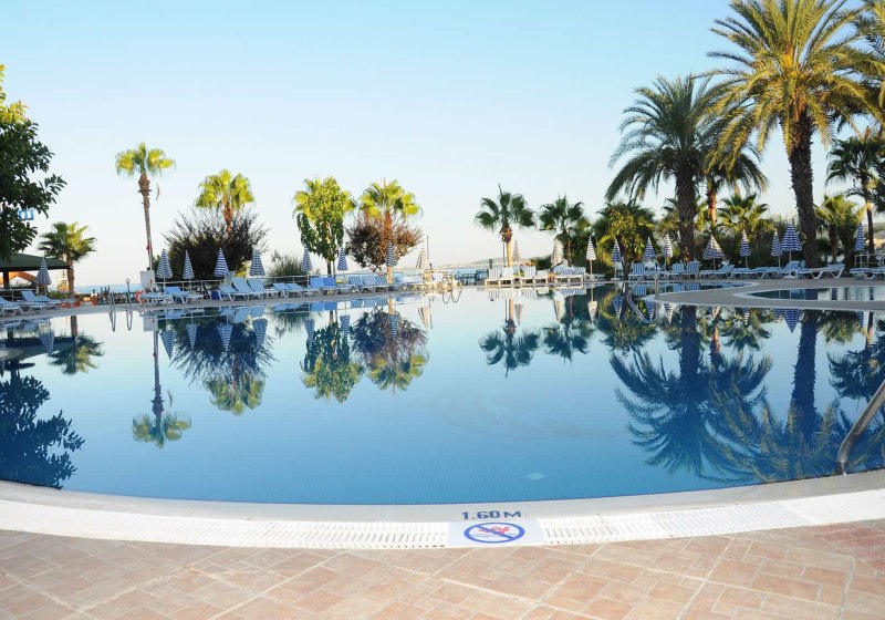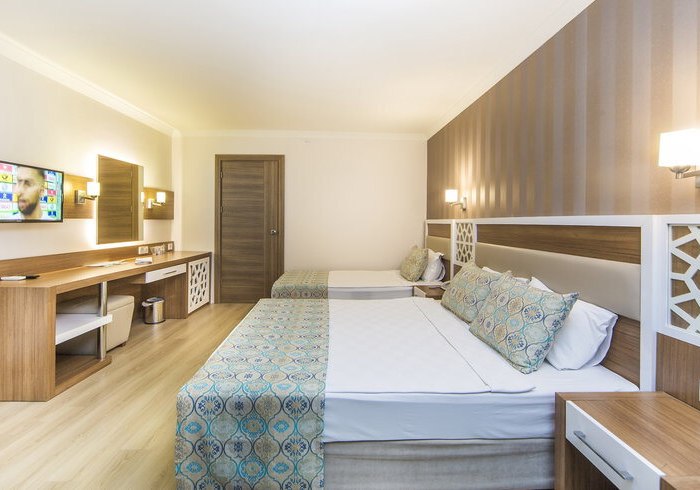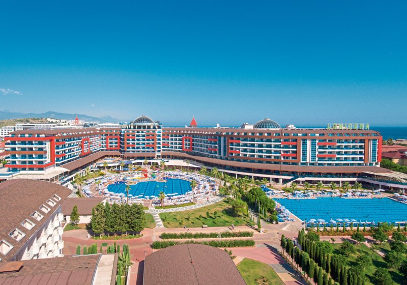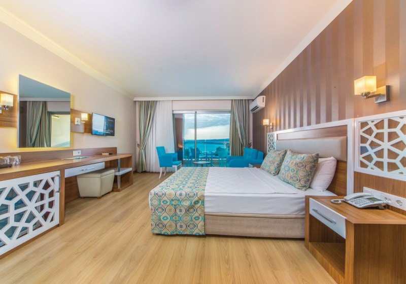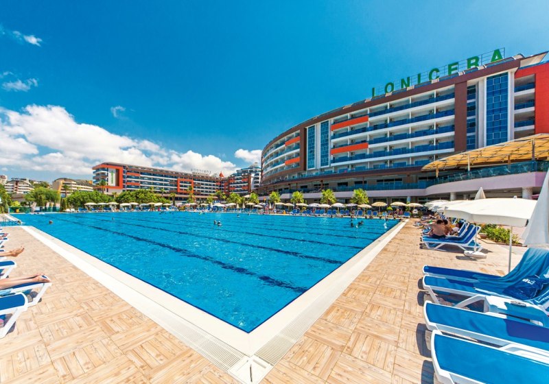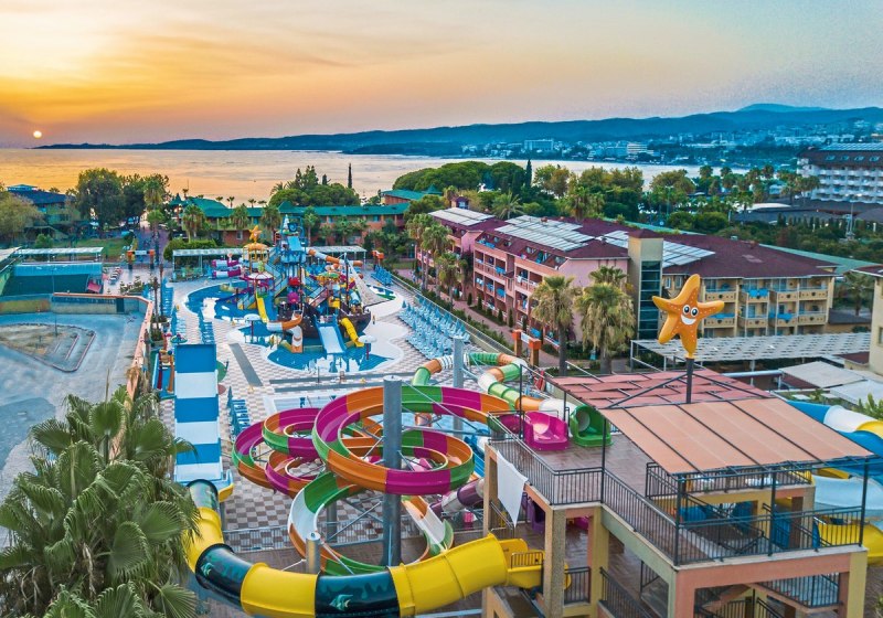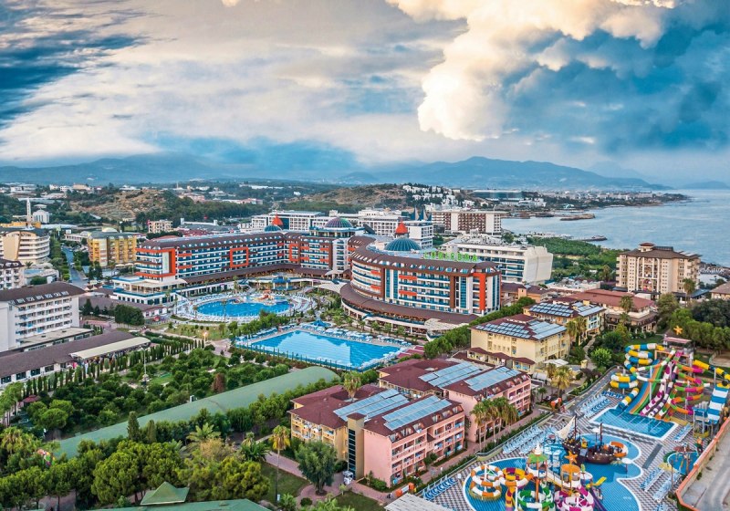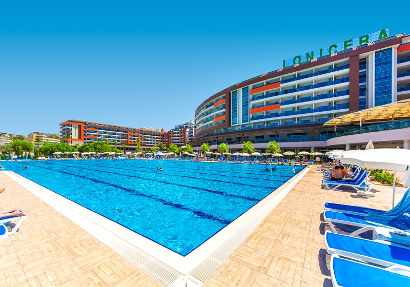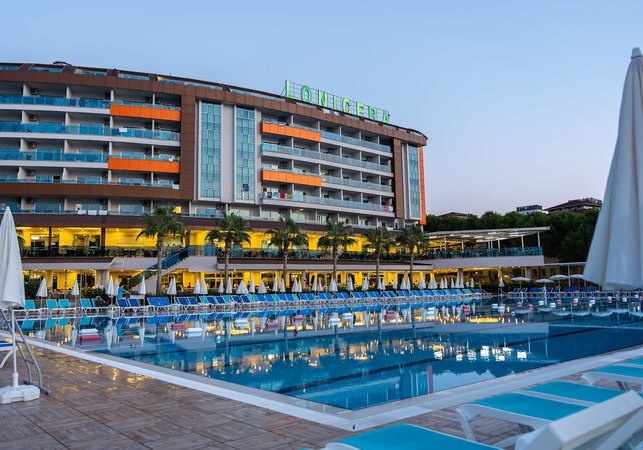 Lonicera Resort & Spa verbindet direkte Strandlage, großen Aquapark mit 19 Rutschen, vielfältige Pools und ein breites Unterhaltungsprogramm. Kulinarisch wählt Ihr zwischen Buffet, À-la-carte mit Fisch oder Kebab sowie praktischen Snackpunkten. Das All-Inclusive-Konzept hält Tagesabläufe unkompliziert.