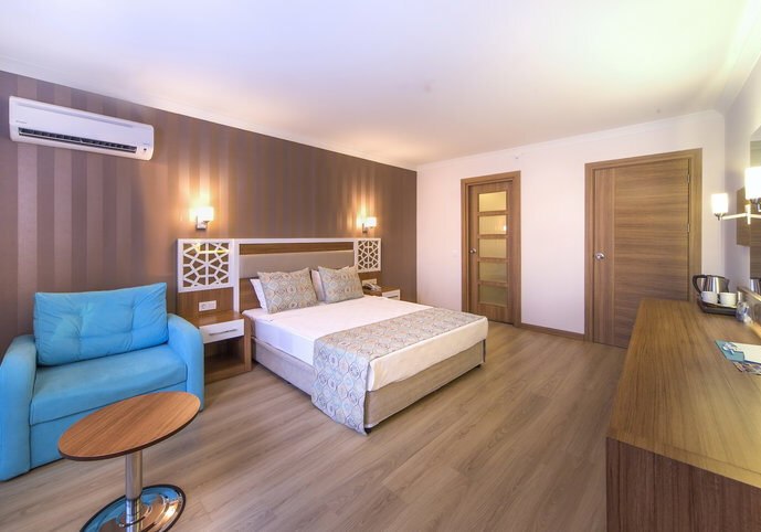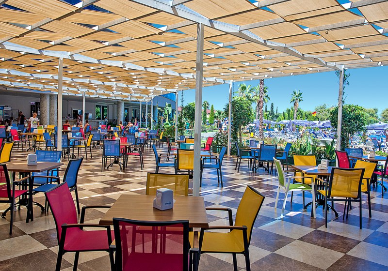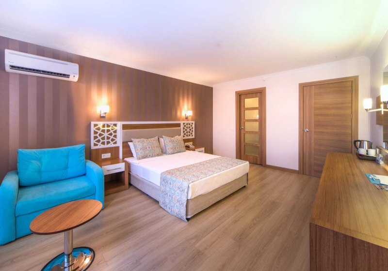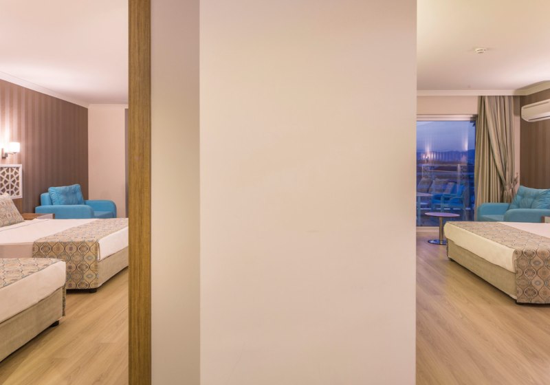 Die Atmosphäre ist dynamisch: Tagsüber Animation, abends Programme und – für Erwachsene – eine Diskothek. Kinder toben im Streichelzoo, im Miniclub und in der Mini-Disco. Kulinarisch wechselt Ihr zwischen Buffetrestaurant, Pool-/Snackbar, Bars und zwei À-la-carte-Optionen mit Fisch oder Kebab. Zimmer und Suiten sind mit Klimaanlage, Balkon oder Terrasse, Sat.-TV, Wasserkocher und Mini-Kühlschrank ausgestattet; Familienzimmer bieten zwei Schlafräume und zwei Duschen/WC, Suiten zusätzlich Laminatboden und Jacuzzi. Im Wellnessbereich warten Hallenbad mit Jacuzzi, Sauna, Türkisches Bad, Dampfbad und Erlebnisduschen; Massagen und Anwendungen sind gegen Gebühr buchbar.