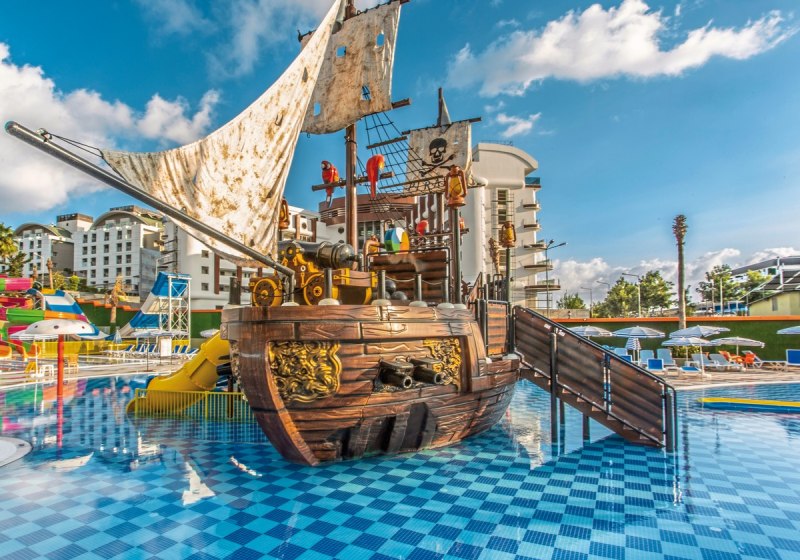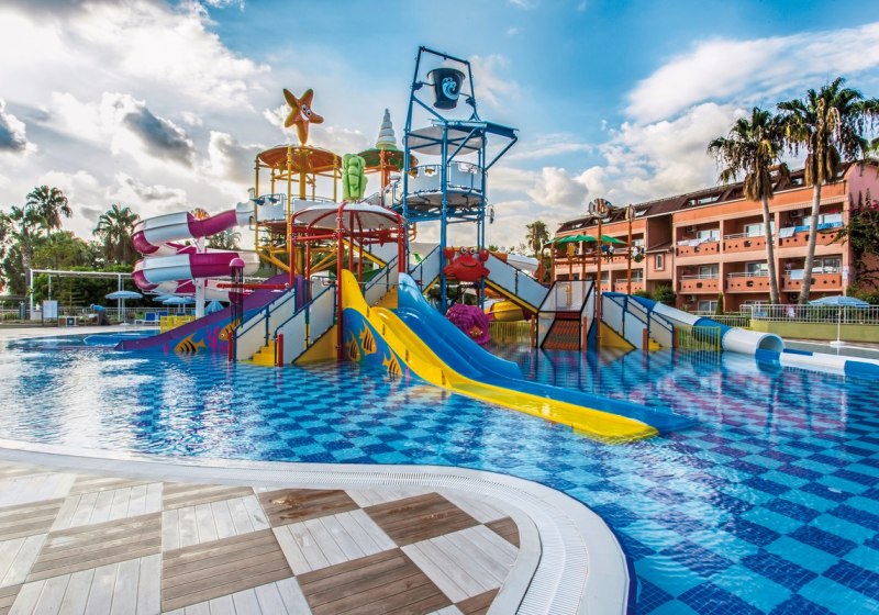 Für Badefreude sorgen vier Süßwasserpools und vier Kinderbecken, der Aquapark mit 19 Wasserrutschen sowie bereitgestellte Liegen, Auflagen, Badetücher und Sonnenschirme an Pool und Strand. Zusätzliche Bereiche wie Bibliothek, TV-Raum, Spielzimmer und Game-Hall setzen ruhige und spielerische Kontraste. Ein Hallenbad erweitert das wetterunabhängige Schwimmen, während Bars, Poolbar und Snackbar die Wege kurz halten.