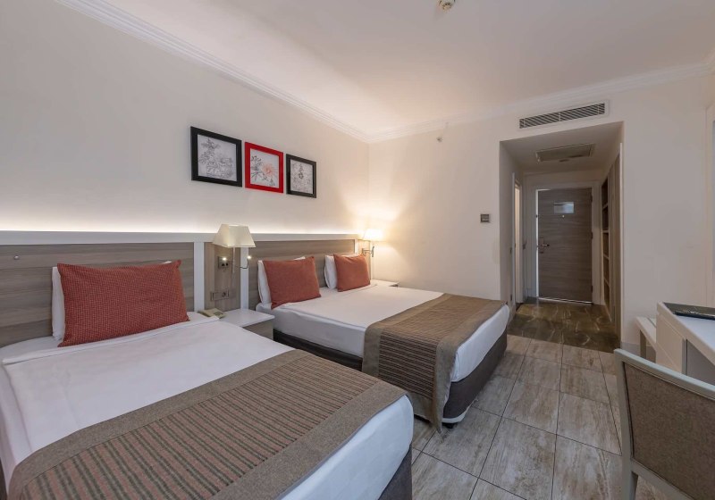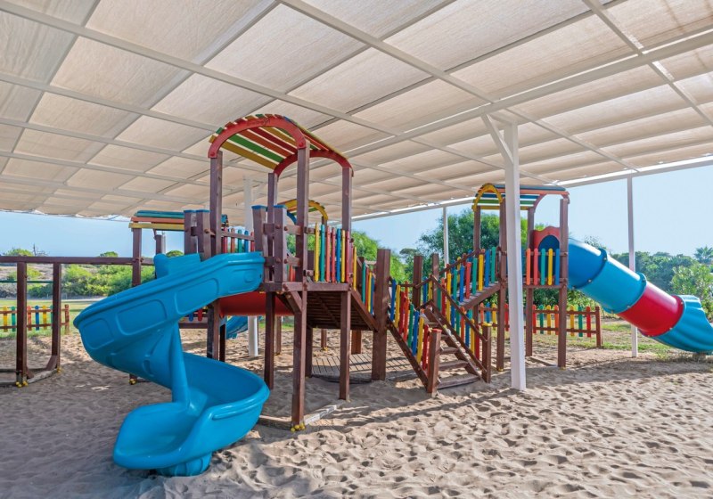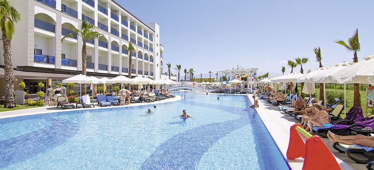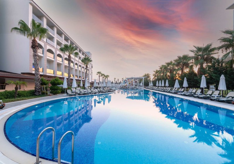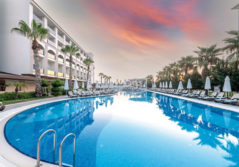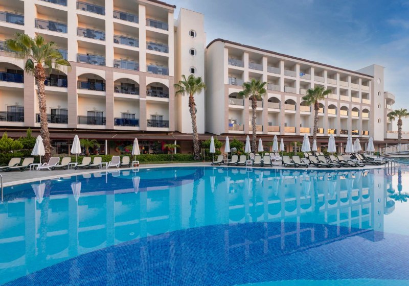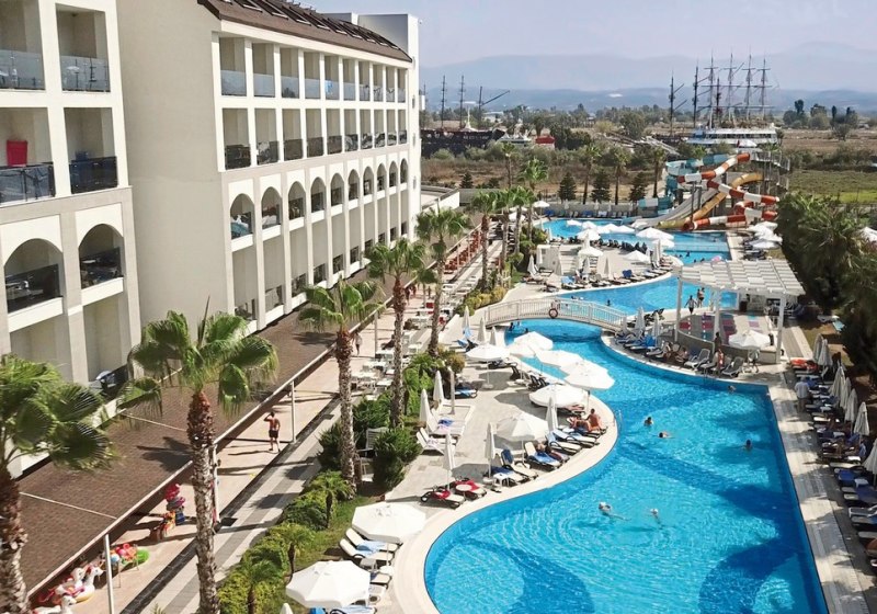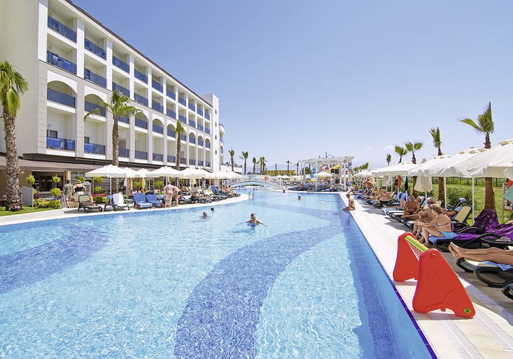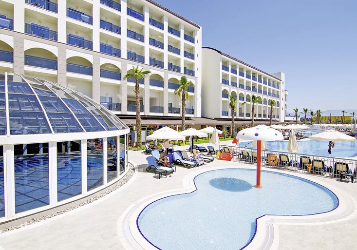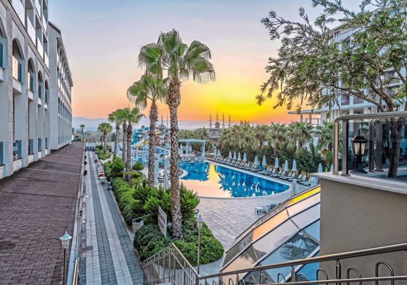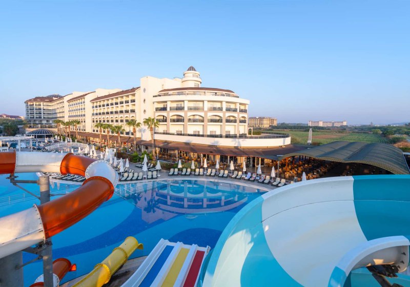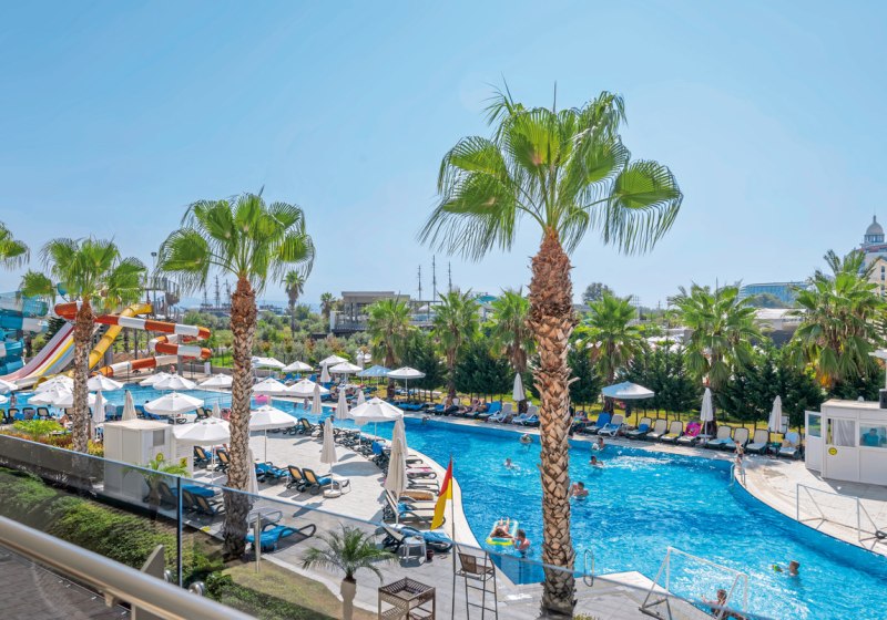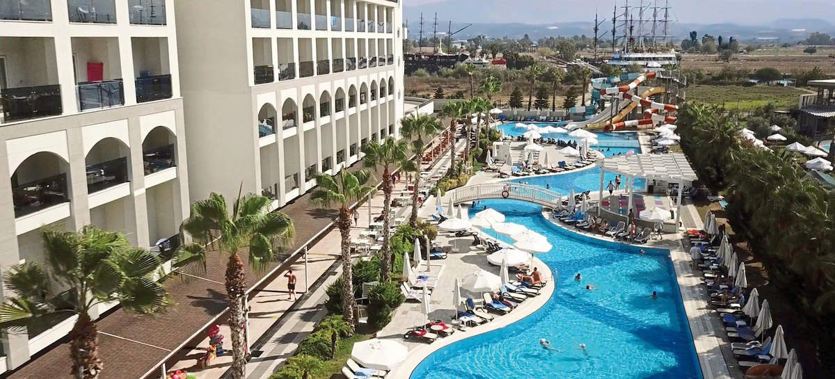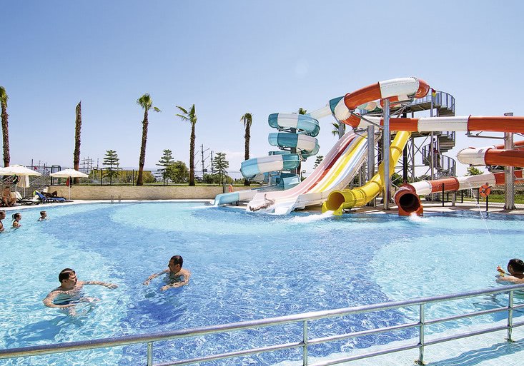 Die Anlage gliedert 407 Zimmer über sieben Etagen mit Lift, zentralem Empfang und Lounge. WLAN ist in der gesamten Anlage und am Strand verfügbar. Im Außenbereich verteilen sich mehrere Süßwasserpools, Kinderbecken und sechs Wasserrutschen rund um die Sonnenterrasse. Liegen, Auflagen, Sonnenschirme und Badetücher stehen am Pool und Strand bereit; der Strand-Shuttle bindet alles zusammen.
