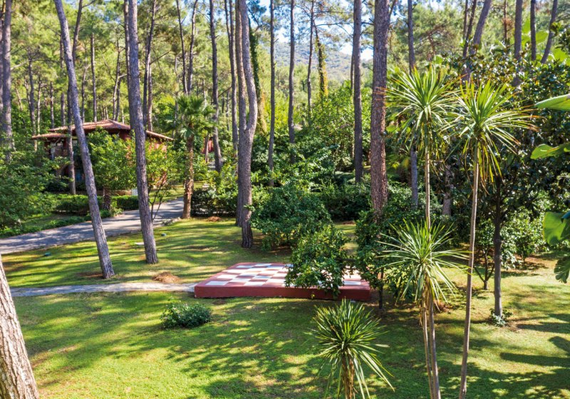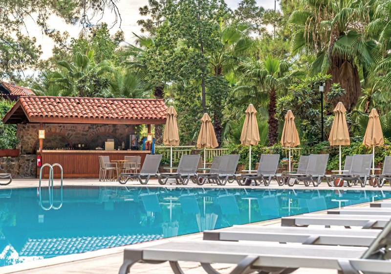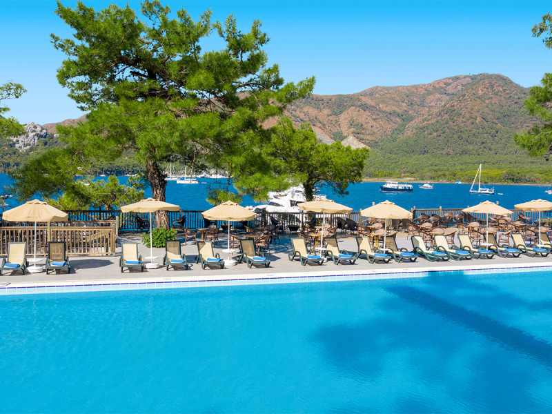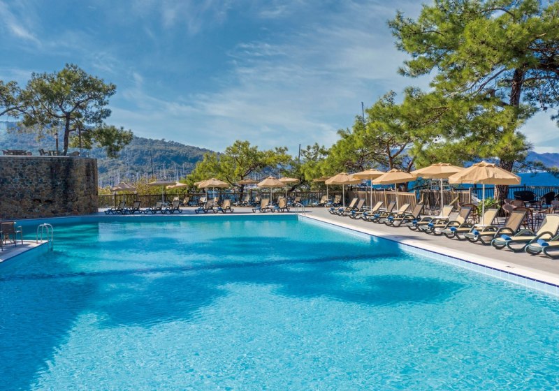 Im Marmaris Bay Resort wohnt Ihr in einer weitläufigen, von Waldhängen umrahmten Anlage direkt am Strand. Die Atmosphäre ist ruhig und erwachsen, denn hier gilt ein Mindestalter von 16 Jahren. Ihr bewegt Euch zwischen Gärten, Sonnenterrassen und zwei Süßwasserpools, einer davon als entspannter Relaxbereich. Der Blick wechselt zwischen geschützter Bucht und grünem Hang – klar gegliedert, großzügig, auf Rückzug und Genuss ausgerichtet.