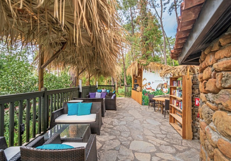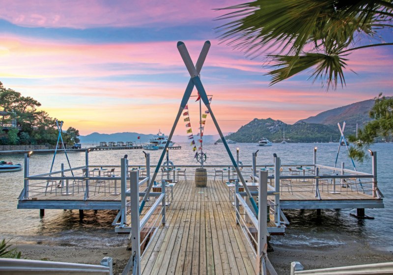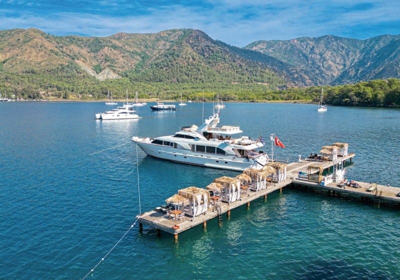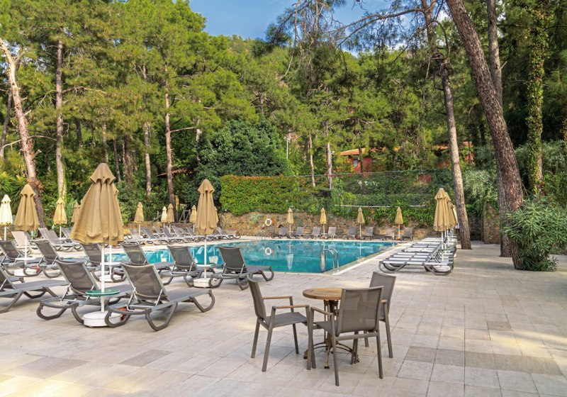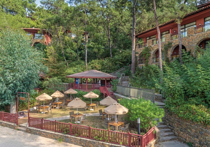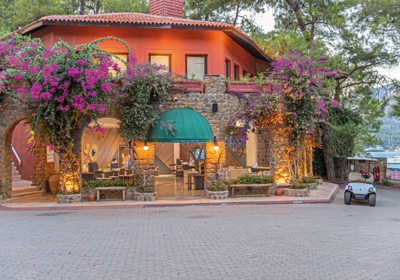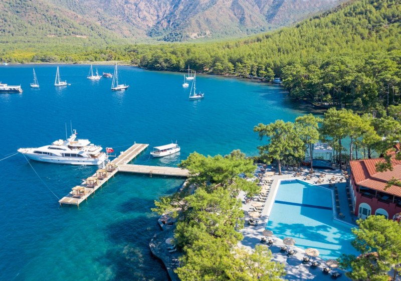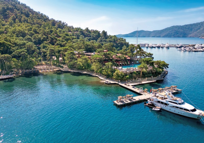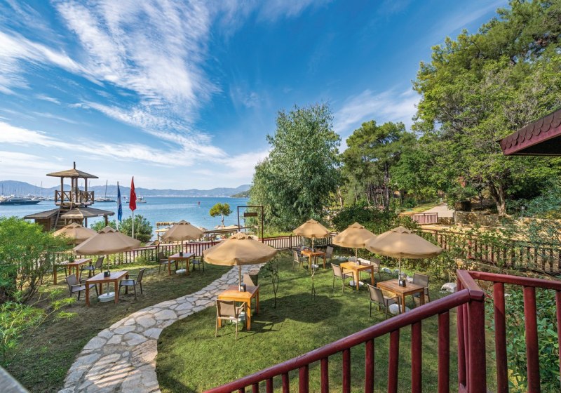 Die Anlage liegt direkt am Strand in einer ruhigen Hanglage am Wald. Bis zum Ortszentrum von Marmaris sind es etwa 10 Kilometer, der Flughafen Dalaman liegt rund 100 Kilometer entfernt. Ihr blickt auf Meer und Bucht, nutzt den Badesteg und profitiert von Strandbars vor Ort. Die Lage wirkt naturnah und abgeschirmt, mit klarer Orientierung zum Wasser.