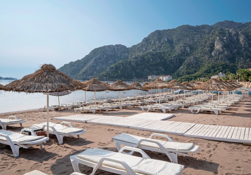 Die Lage ist der Trumpf: Das Haus wird lediglich von der Promenade vom Sand-Kies-Strand getrennt, das Meer liegt etwa 10 Meter entfernt. Bis ins Zentrum von Marmaris sind es circa 8 Kilometer; an der Hauptstraße verkehren öffentliche Minibusse. Rund 200 Meter trennen Euch von Restaurants, Einkaufsmöglichkeiten und dem ÖPNV.