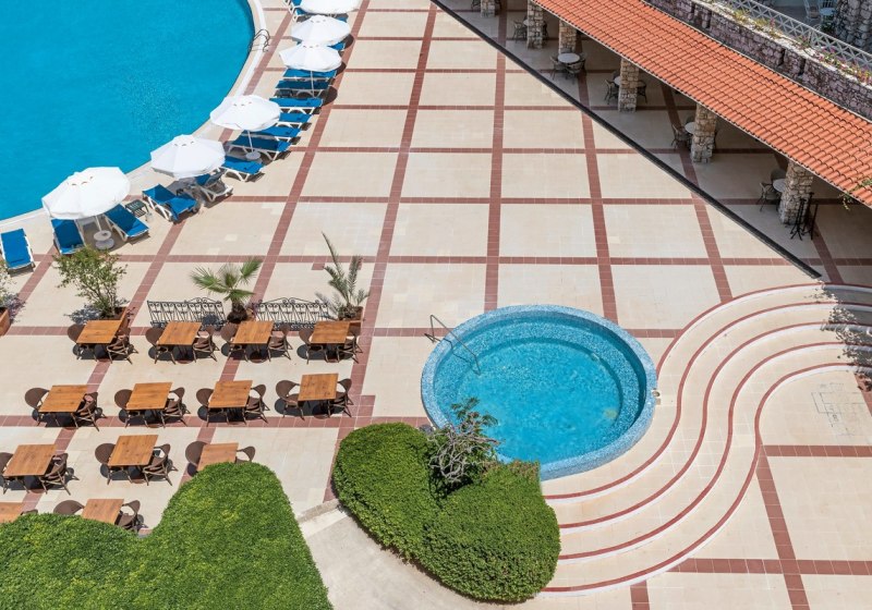 Die Hotelanlagen sind kompakt und gut gegliedert: Garten, Außenpool, Sonnenterrasse und direkte Strandnähe bilden kurze Wege. Liegen, Auflagen und Sonnenschirme stehen am Pool und am Strand bereit. WLAN ist in öffentlichen Bereichen und Zimmern nutzbar; Aufzüge verbinden 4–5 Etagen mit 197 Zimmern.
