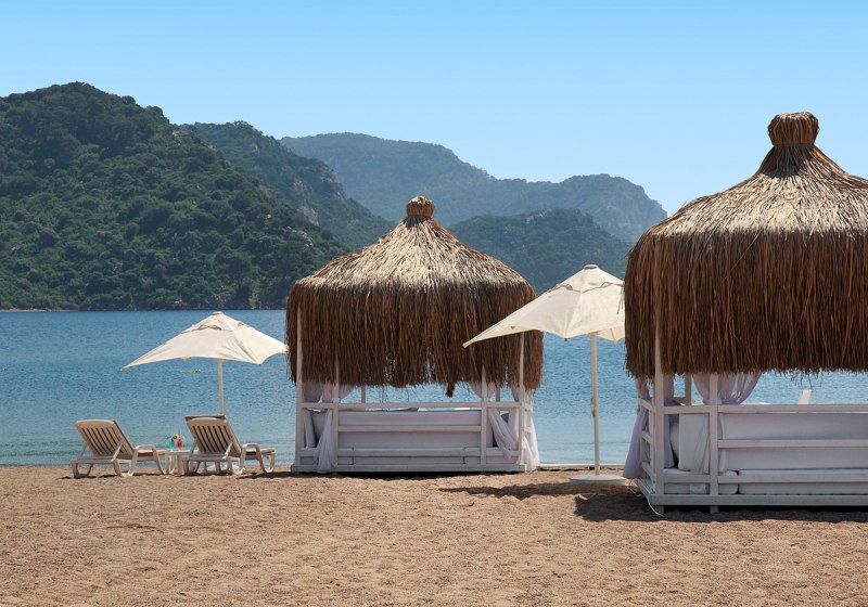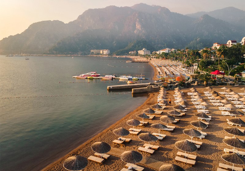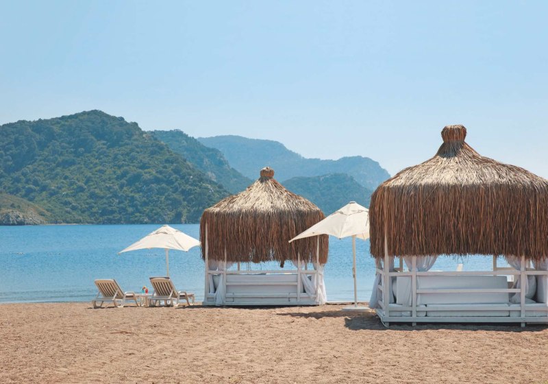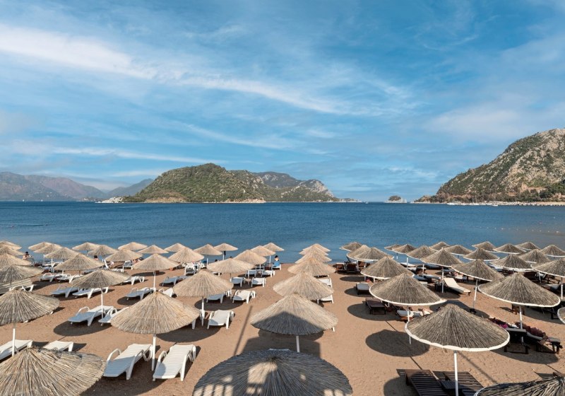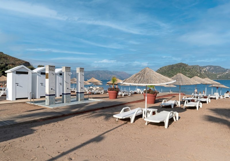 Ihr residiert direkt an der Uferpromenade, der Sand‑Kies‑Strand liegt gleich gegenüber. Bis zum Stadtzentrum von Marmaris sind es etwa 8 km; das Touristenzentrum erreicht Ihr nach rund 1 km. Park in 100 m, ÖPNV in 50 m, Bars, Restaurants und Shops in 150 m. Highlight: Direkte Strandlage plus kurze Wege zu Infrastruktur und Ausflügen.