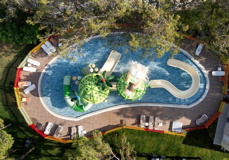 - Badelandschaft: Pools, Rutschen und Kinderbecken strukturieren den Wasserspaß.