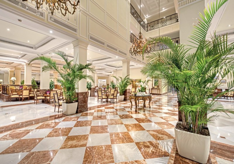Die Infrastruktur ist umfassend: Rezeption und Lobby mit WLAN in der gesamten Anlage, Geschäfte, Friseur, Supermarkt und mehrere Bars. Zwei Süßwasserpools mit Sonnenterrassen, dazu Liegen, Sonnenschirme und Badetücher an Pool und Strand schaffen klare Zonen für entspannte Tage.