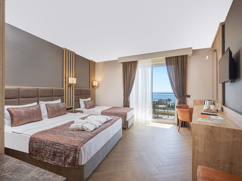 • Klimaanlage • Balkon (je nach Zimmerkategorie) • Kühlschrank • Haartrockner • Sitzecke (je nach Zimmerkategorie) • Minibar (gegen Gebühr) • Safe (kostenfrei) • Meerblick (je nach Zimmerkategorie) • Schlafsofa • Kaffee-/Teezubereiter • Fernseher • rollstuhlgerechte Zimmer (auf Anfrage) • WiFi (kostenfrei) • Balkon oder Terrasse • Bergblick • Schallisolation • Steckdose • Holz/Parkett