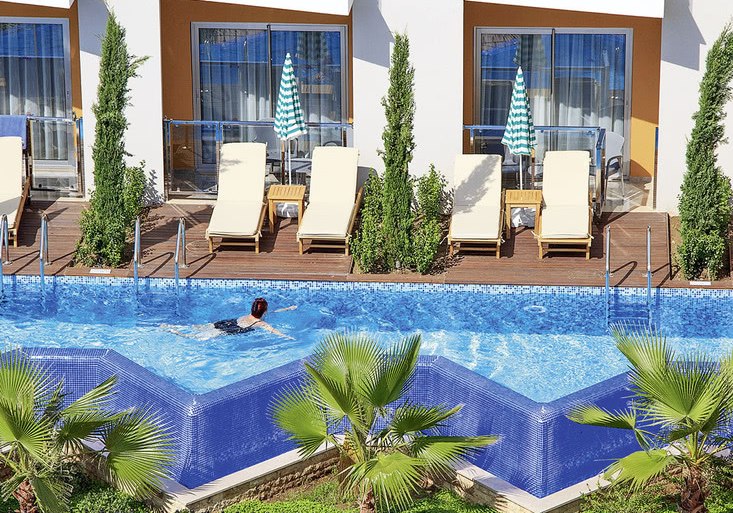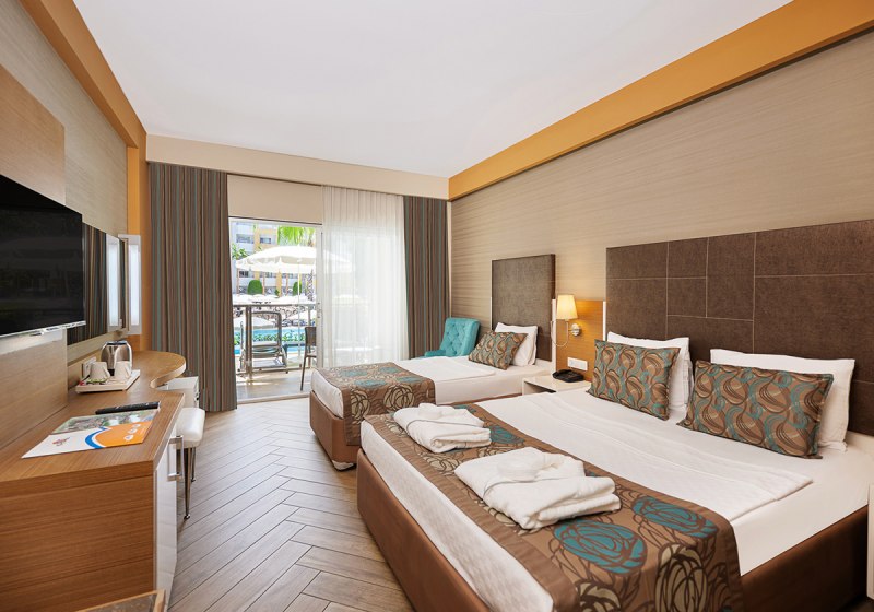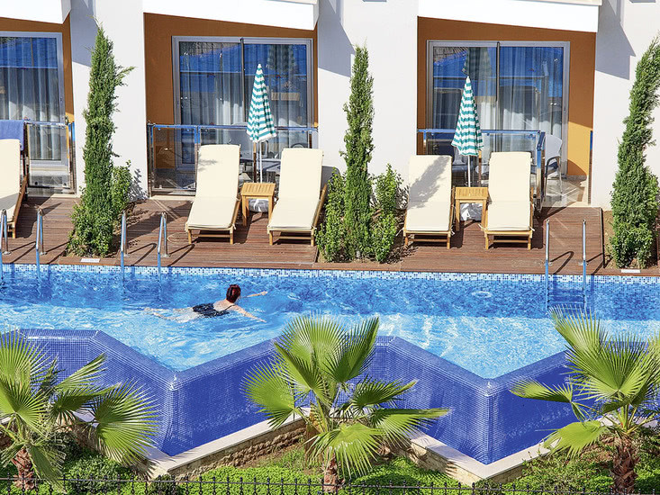 Die Doppelzimmer Swim-Up punkten mit Terrasse, zwei Liegen und direktem Poolzugang. Suiten (ca. 35 m²) kombinieren Doppelbett und Einzelbett mit Stehbalkon. Auf Anfrage stehen rollstuhlgerechte Zimmer und Babybetten bereit. Optional ergänzen Ausstattungen wie Schreibtisch oder Sitzecke je nach Kategorie. Highlight: Swim-Up-Zimmer mit Terrasse und direktem Zugang zum Wasser.