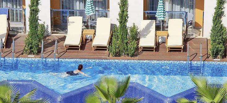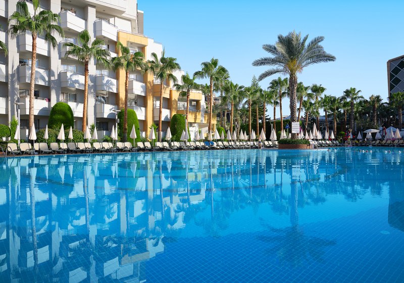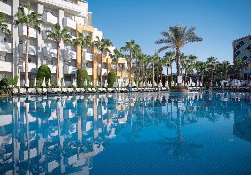 Die Infrastruktur ist breit aufgestellt: Empfangshalle, Lifts in allen Gebäudeteilen, Geschäfte, Sat-TV-Ecke und flächendeckendes WLAN inklusive. Draußen öffnen sich Sonnenterrassen, die Poollandschaft mit drei Süßwasserpools, separatem Kinderbecken und Rutschenpool. Badetücher, Liegen, Auflagen und Sonnenschirme sind an Pool und Strand bereits eingeplant.