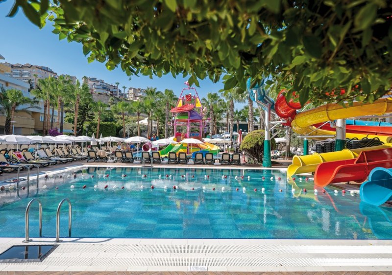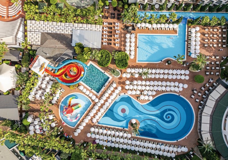 • Liegestühle • Hallenbad • Außenpool • Sonnenschirme • Pool • Poolbar • Sonnenterrasse • Badetücher • Wasserrutsche • Wasserpark