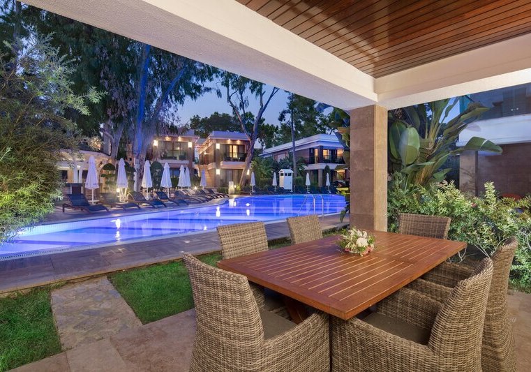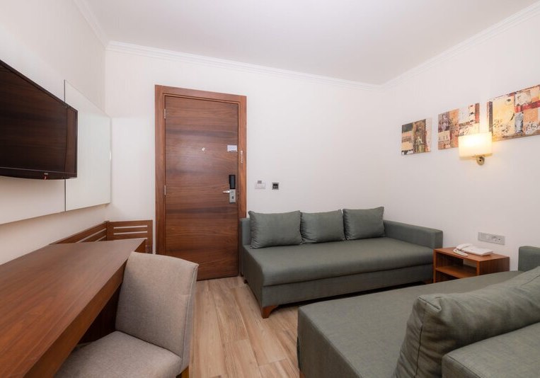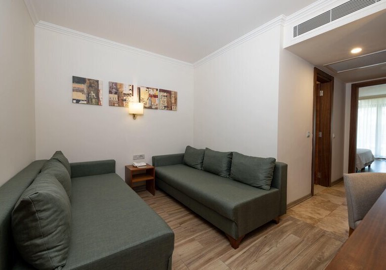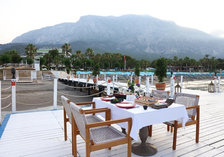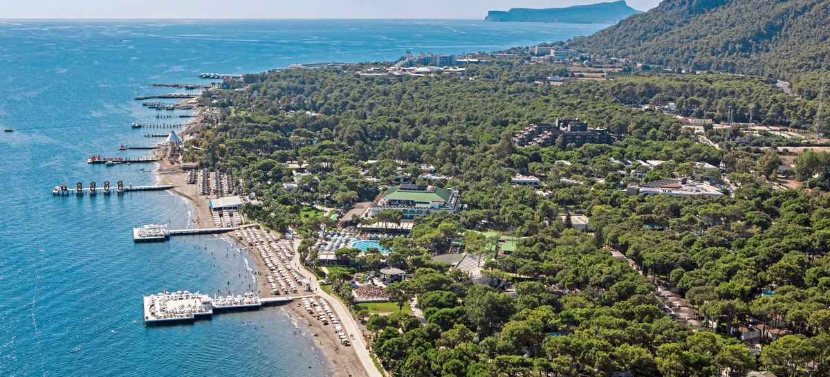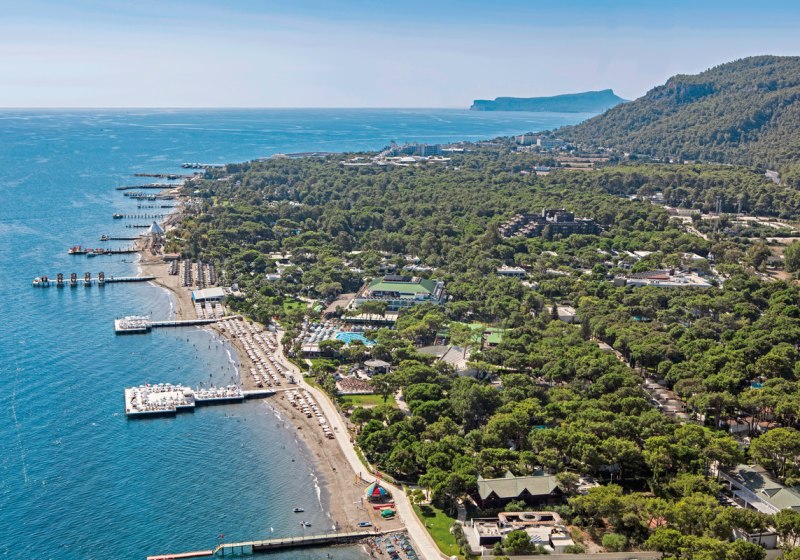Ihr wohnt in Beldibi, direkt am Sand‑Kiesstrand mit drei Badestegen. Das Ortszentrum erreicht Ihr in wenigen Gehminuten, Kemer liegt etwa 19 Kilometer entfernt. Der Beachclub und zwei Strandbars bündeln das Geschehen tagsüber am Meer, während die autofreie Lage für klare Wege zwischen Garten, Pools und Strand sorgt. Highlight: Strandlage mit kurzer Distanz ins Zentrum Beldibi.