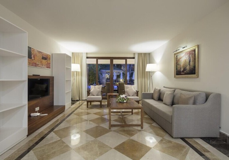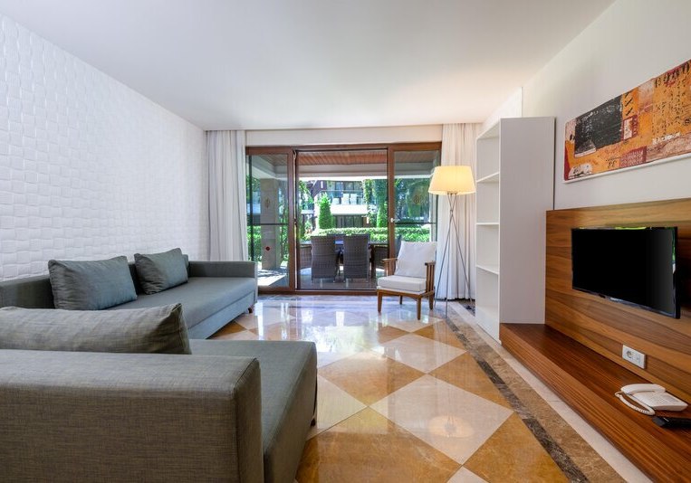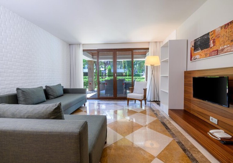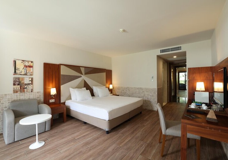Im Nirvana Mediterranean Excellence wohnt Ihr in einer weitläufigen Anlage zwischen zwei Hauptgebäuden, niedrigen Nebentrakten und Villen. Die Gartenwege führen Euch zum Sand‑Kiesstrand und zu Pools, darunter ein Salzwasser-Hauptpool. WLAN erreicht Gebäude und große Teile der Außenbereiche, die Atmosphäre bleibt trotz Größe übersichtlich und strukturiert. Highlight: Familienresort am Strand mit Aquapark und ruhigen Villenbereichen.