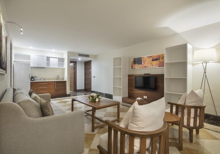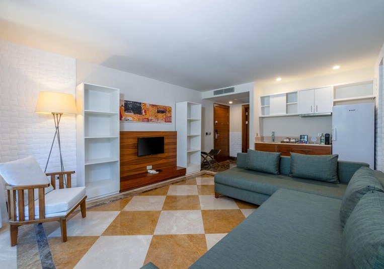 Das Haus setzt auf Komfort mit 537 Zimmern, Lobbybar und Lifts, ergänzt durch Shops und einen ausgewiesenen Haustierbereich. Der Aquapark mit 11 Rutschen bringt Tempo ins Programm, während Sonnenterrassen, Piers und separate Süßwasserpools bei den Villen für Abwechslung sorgen. Haustiere sind erlaubt, sechs Doppelzimmer sind rollstuhlgerecht ausgelegt.